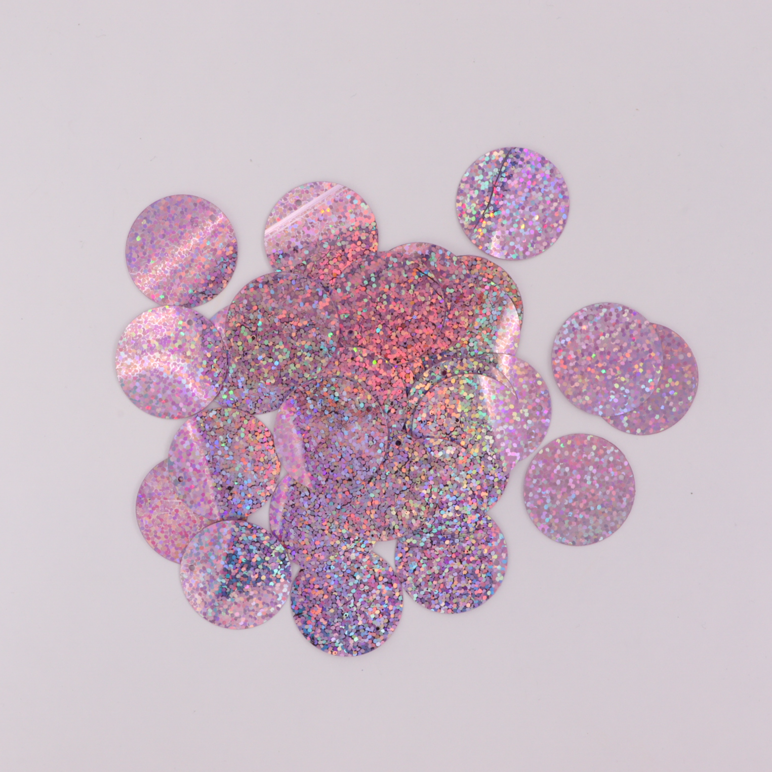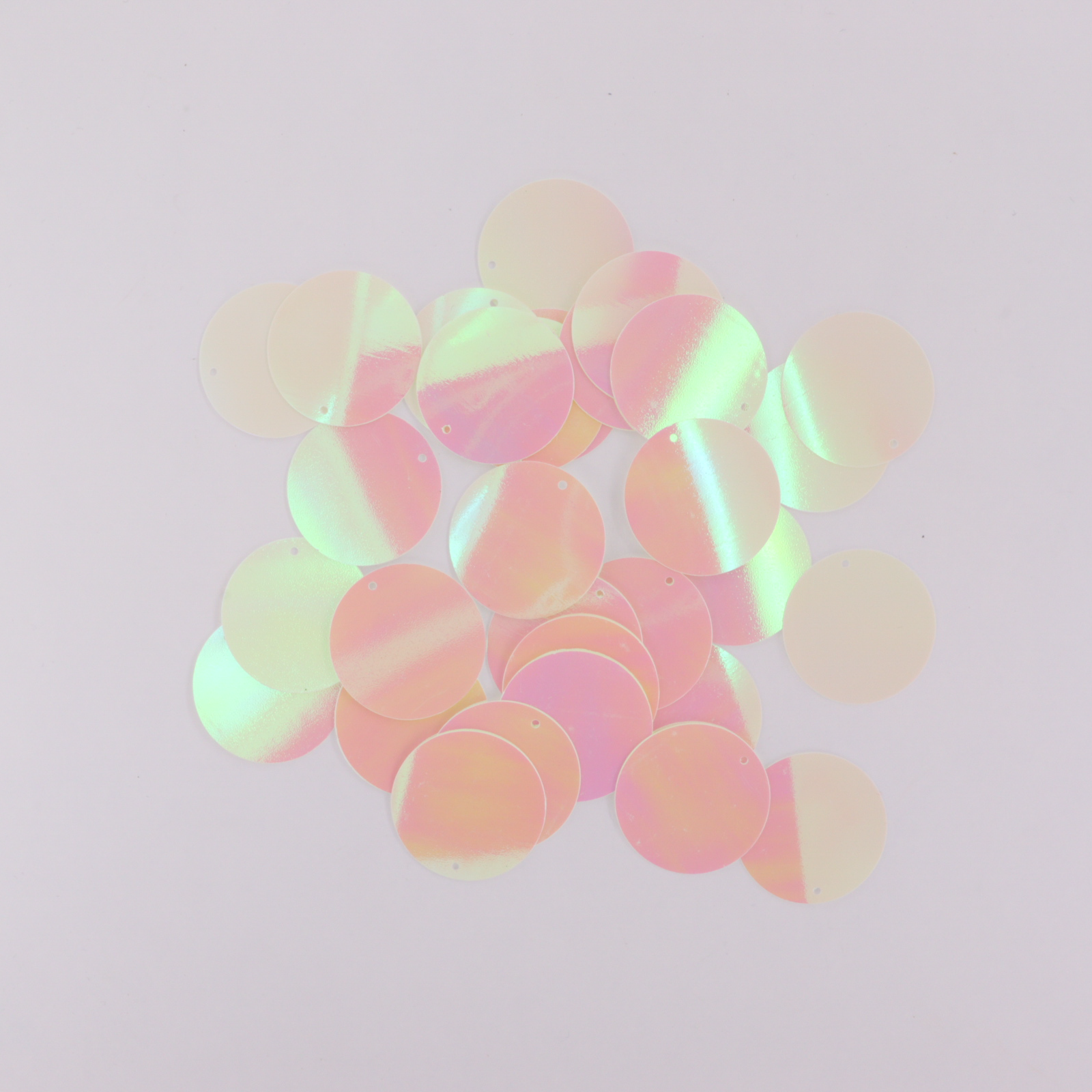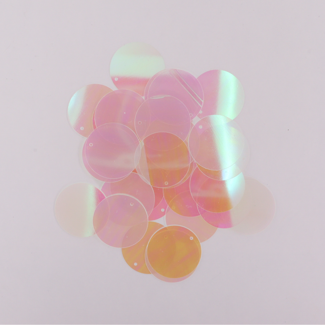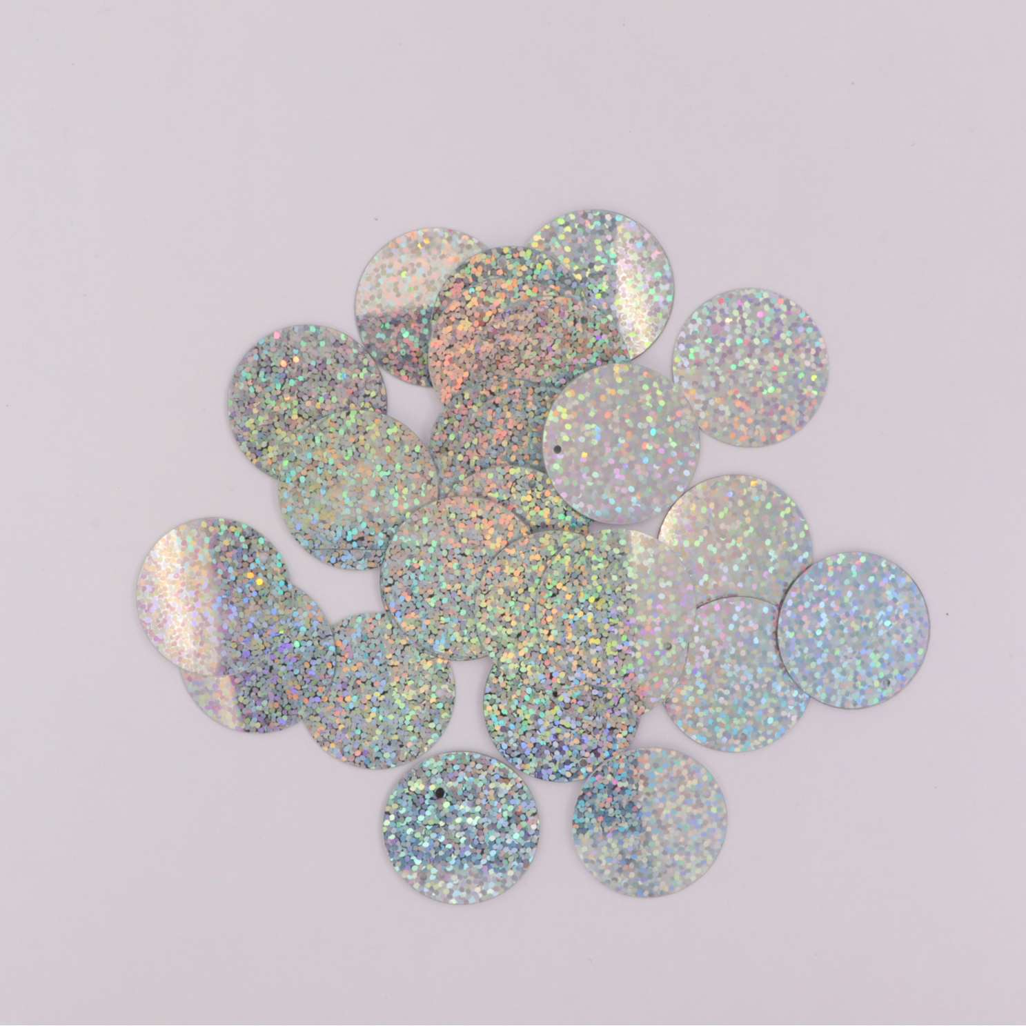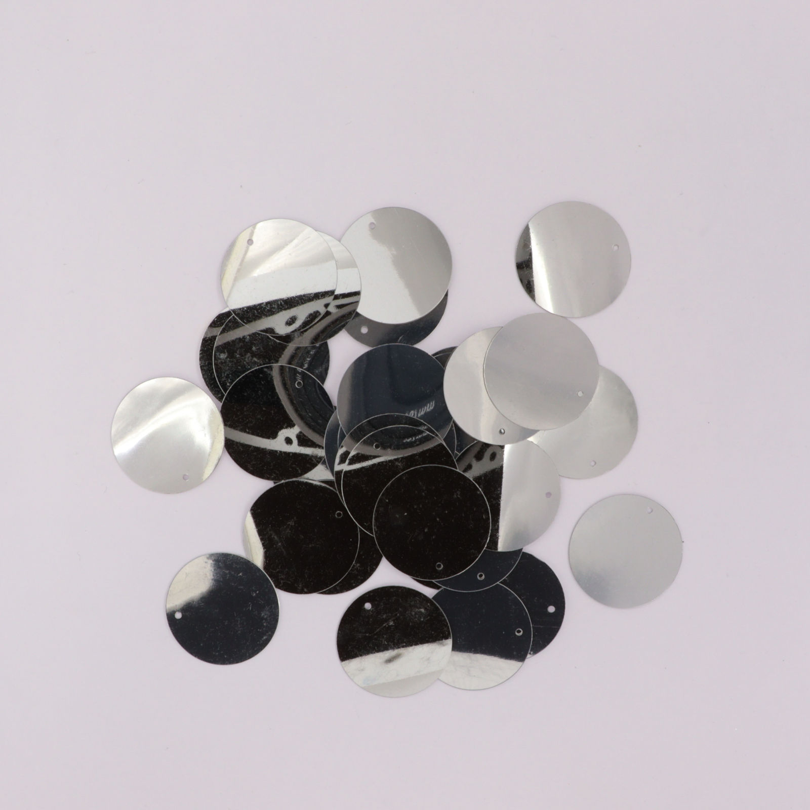 Store, runde pailletter på 30 mm, perfekte til kreative projekter, smykker, pynt eller kostumer. De har en glansfuld overflade, der fanger lyset smukt og giver et festligt, iøjnefaldende udtryk.