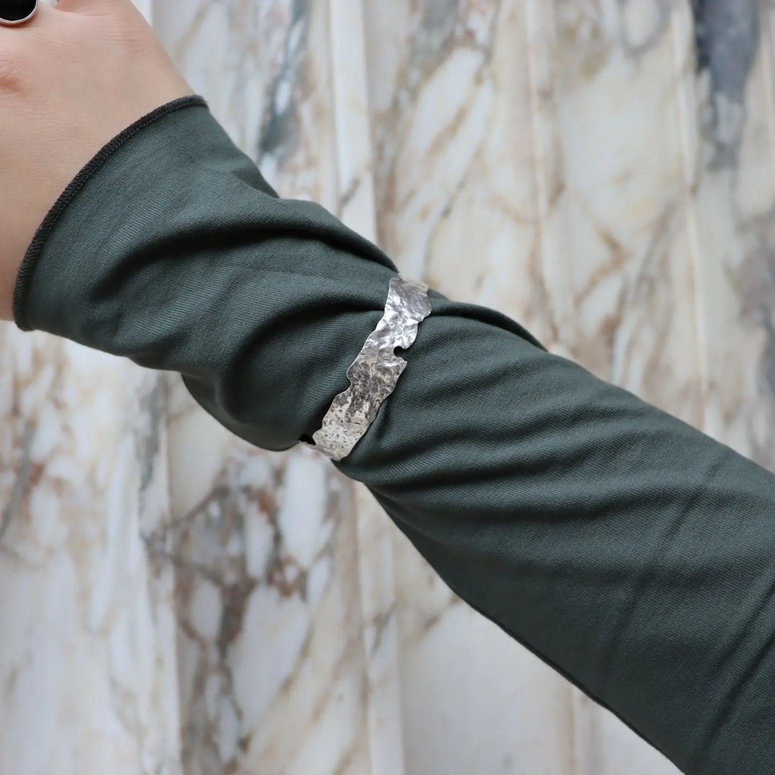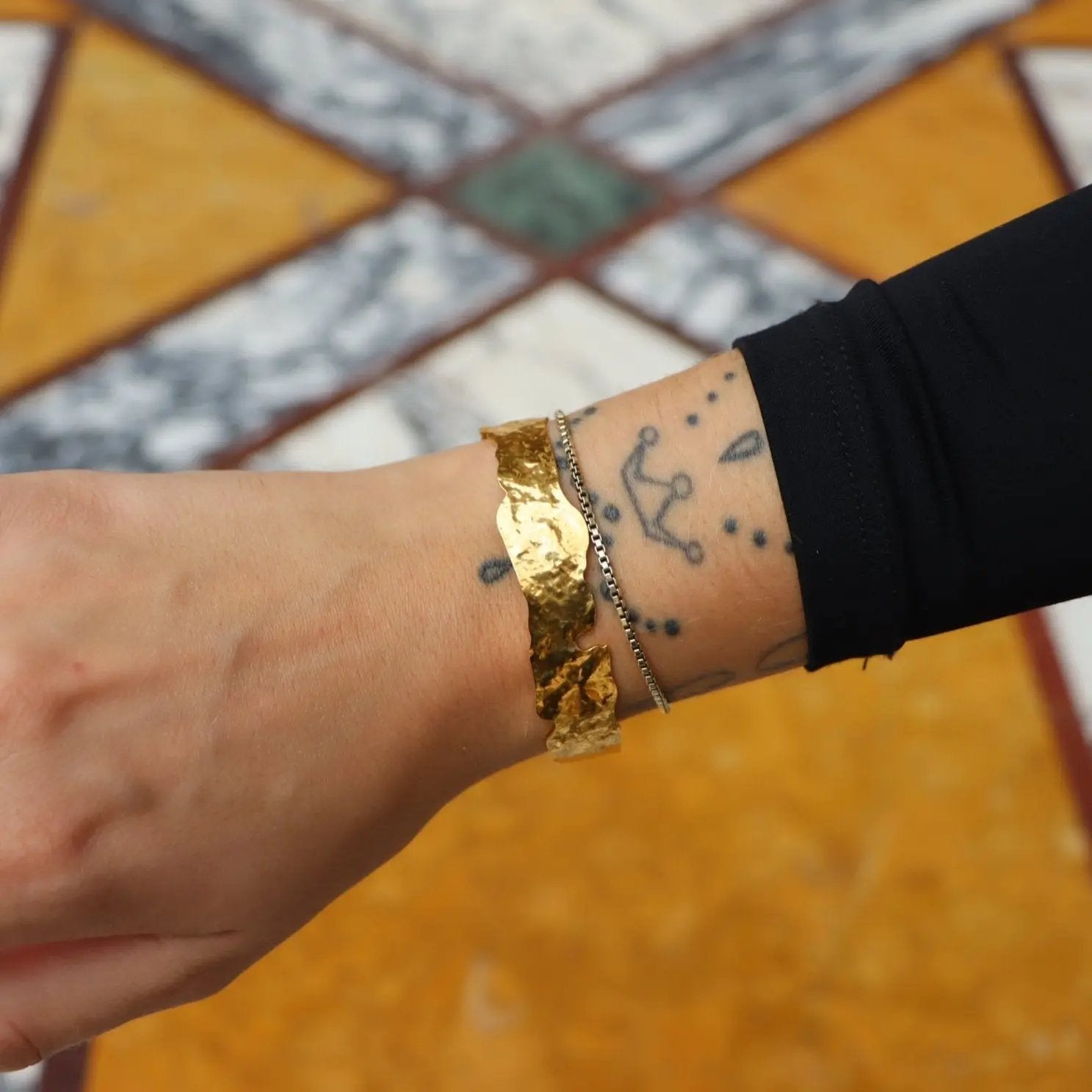 Upptäck elegans och enkelhet förenade i vårt armband, som kombinerar förgylld och silverpläterad mässing i en unik, organisk design. Detta öppna armband omsluter naturligt din handled och ger en touch av lyx till alla tillfällen. Med måtten 62 x 50 mm passar det vackert och ger en framträdande men ändå raffinerad närvaro.