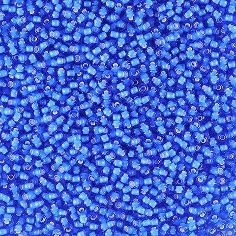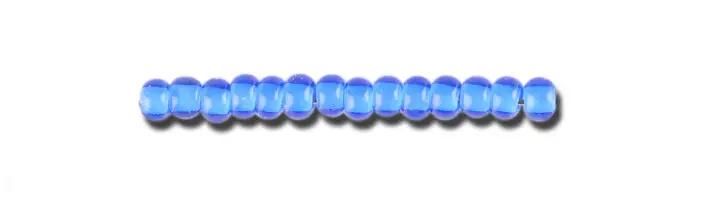 Transparenta små glaspärlor i lätt safirblått med vitt foder.