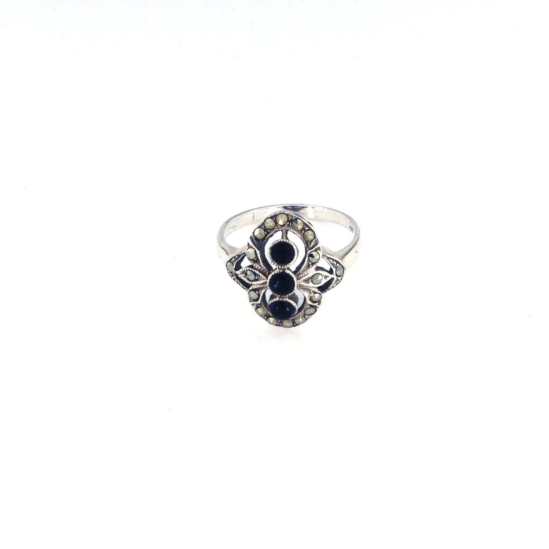 1920 -talets inspirerade fingerring med tre runda onyx och små hematitkristaller inramade i sterlingsilver.