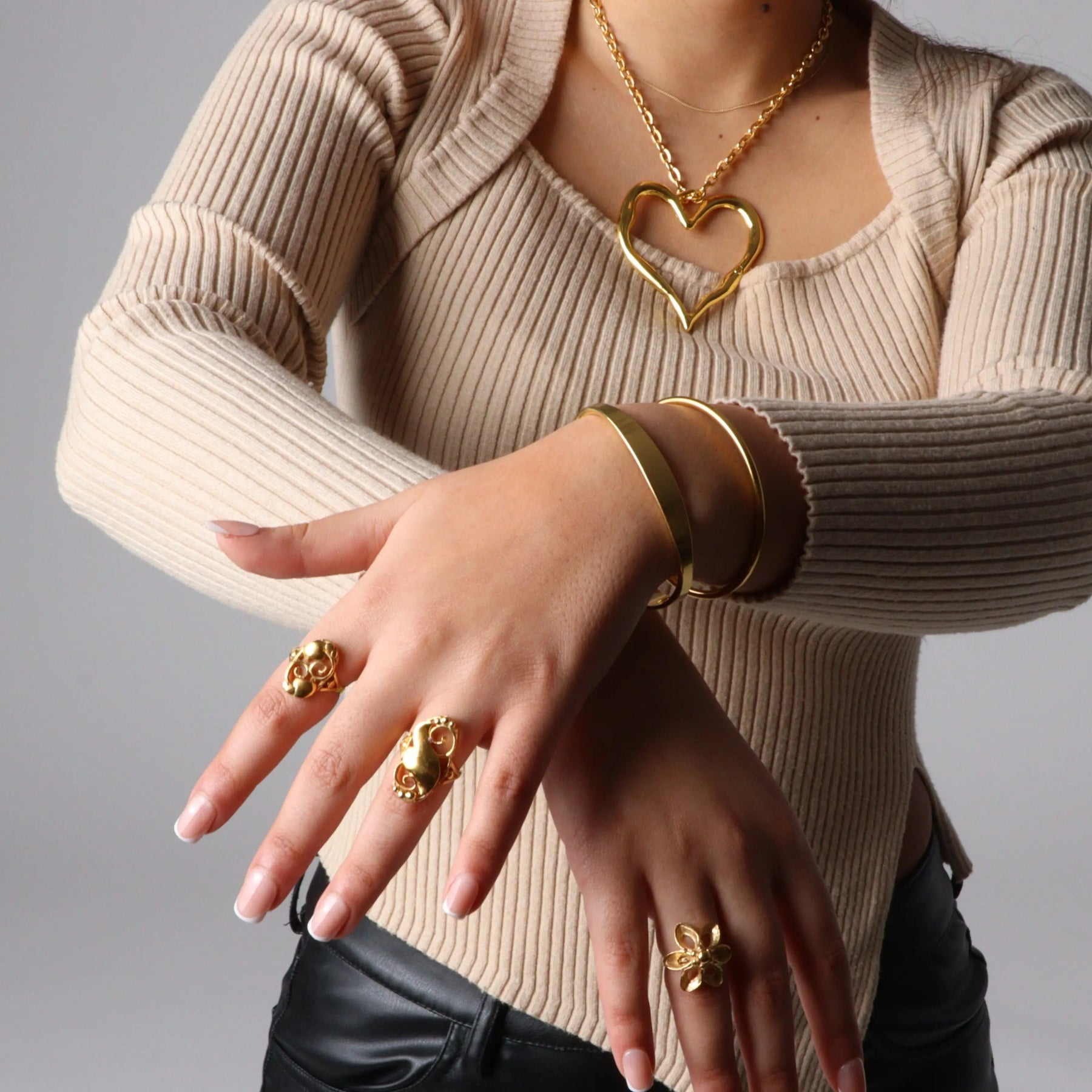 Upplev skönheten hos en fingerring som kombinerar elegans med ett unikt, handgjort motiv. Denna ring, tillverkad av förgyllt sterlingsilver, är prydd med ett stort blad, spiraler och kulor, vilket ger den ett organiskt och tidlöst utseende. Det tjocka lagret av 18 karats guld säkerställer att förgyllningen håller länge, så att du kan bära den med stolthet.