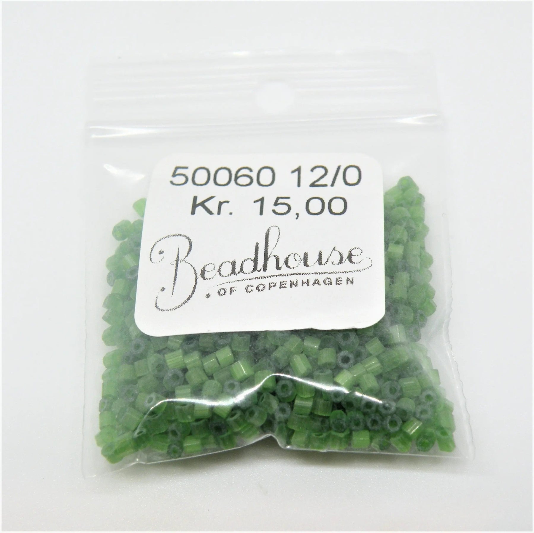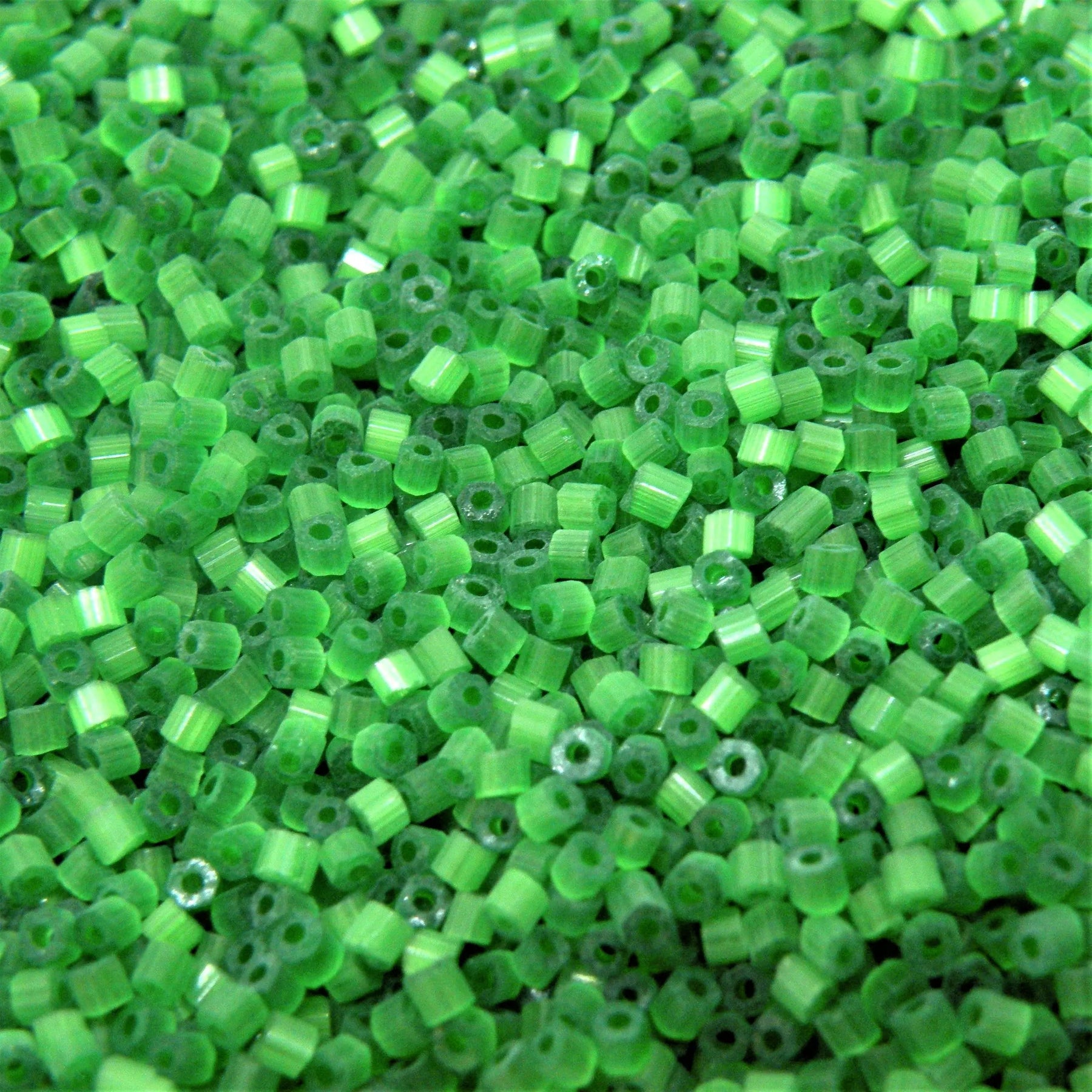 Små rörformade pärlor i en vacker grön färg från preciosa, med rund hål och hexagonal yta. Den hexagonala ytan ger pärlorna ett satinliknande utseende, lite som glasfiber.