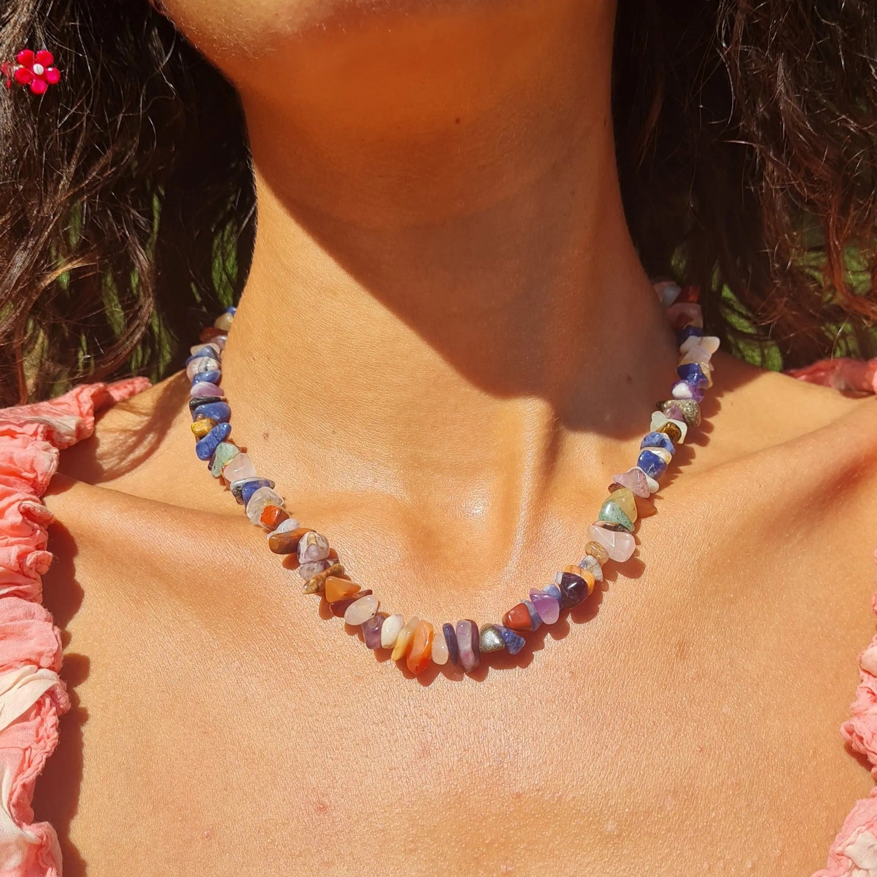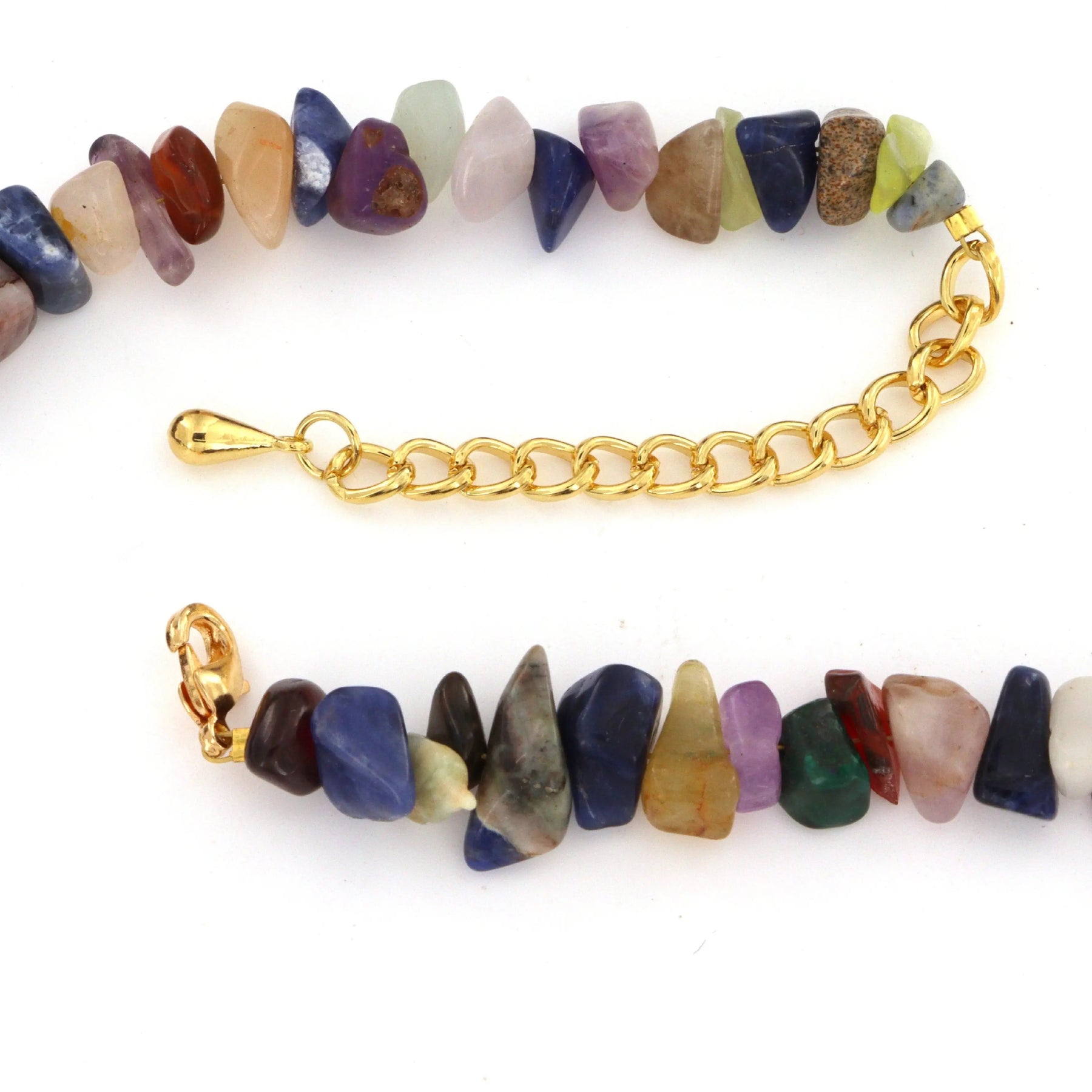 Justerbart halsband av blandade smycken chips med lås och kedjeförlängning i förgyllt stål. Färgerna kan variera något när detta halsband är tillverkat av ett stort glas rester av smycken chips från vår andra produktion av halsband med smycken chips.