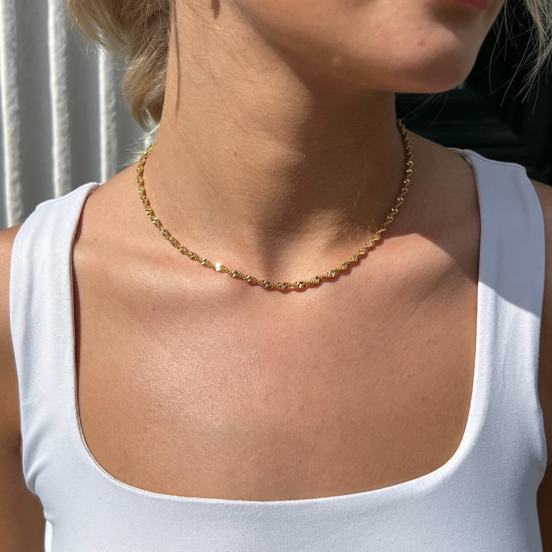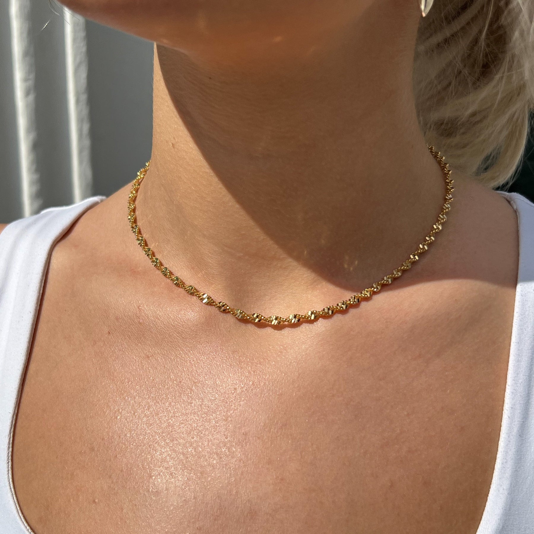 Detta chunky Singapur-halsband i guldpläterad mässing är ett uttalande smycken med sin vackra bredd på 3,6 mm och längd på 40 cm. Med sin tvinnade design och gyllene glans kan halsbandet bäras ensam för en snygg look eller utformad med andra smycken för ett mer personligt uttryck. Ett måste för dem som älskar en kombination av klassisk och modern stil.