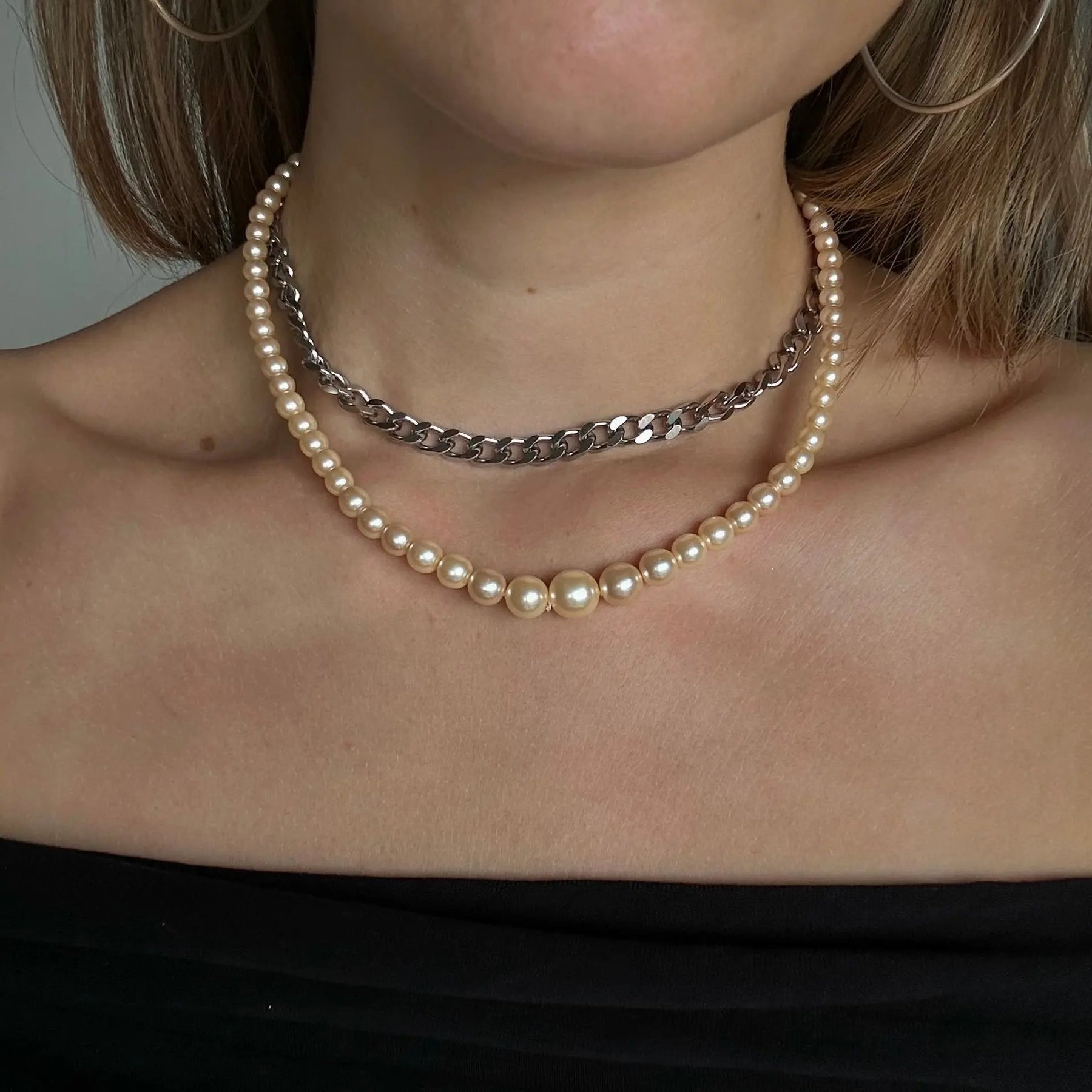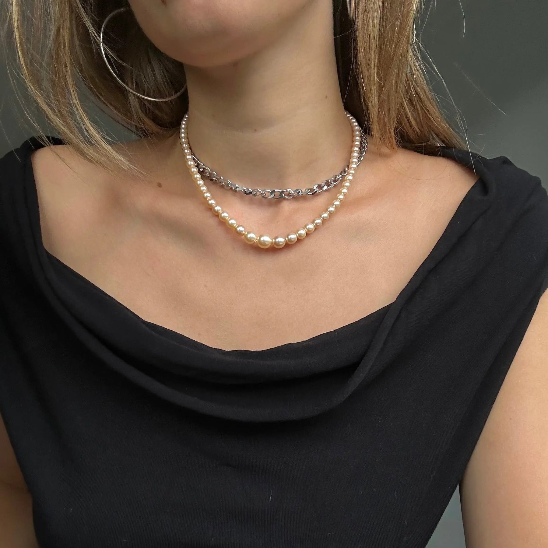 Halsband, graderad champagne -färgad vaxpärlkedja, silverpläterad mässing