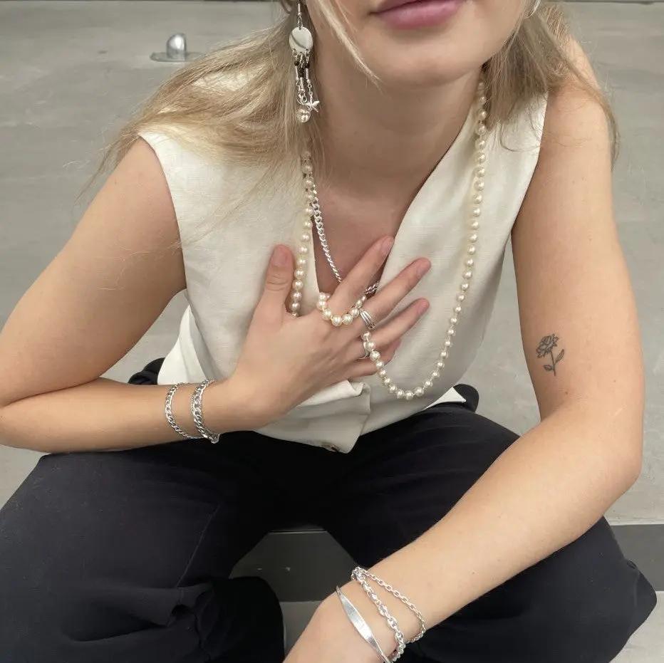Klassiska och billiga halsband av off -white plastpärlor, utan lås.