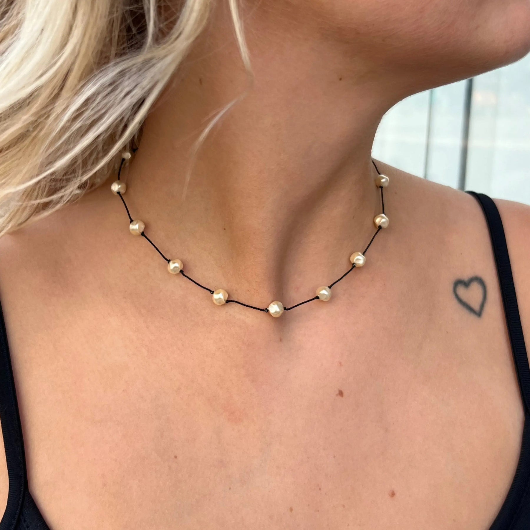 Upptäck den enkla elegansen på vårt halsband med vita vaxpärlor, fint ordnade på en slät svart nylonkabel. Detta klassiska halsband är klar med ett silverpläterat mässingslås som båda lägger till en touch av glans och säkerställer en säker stängning.