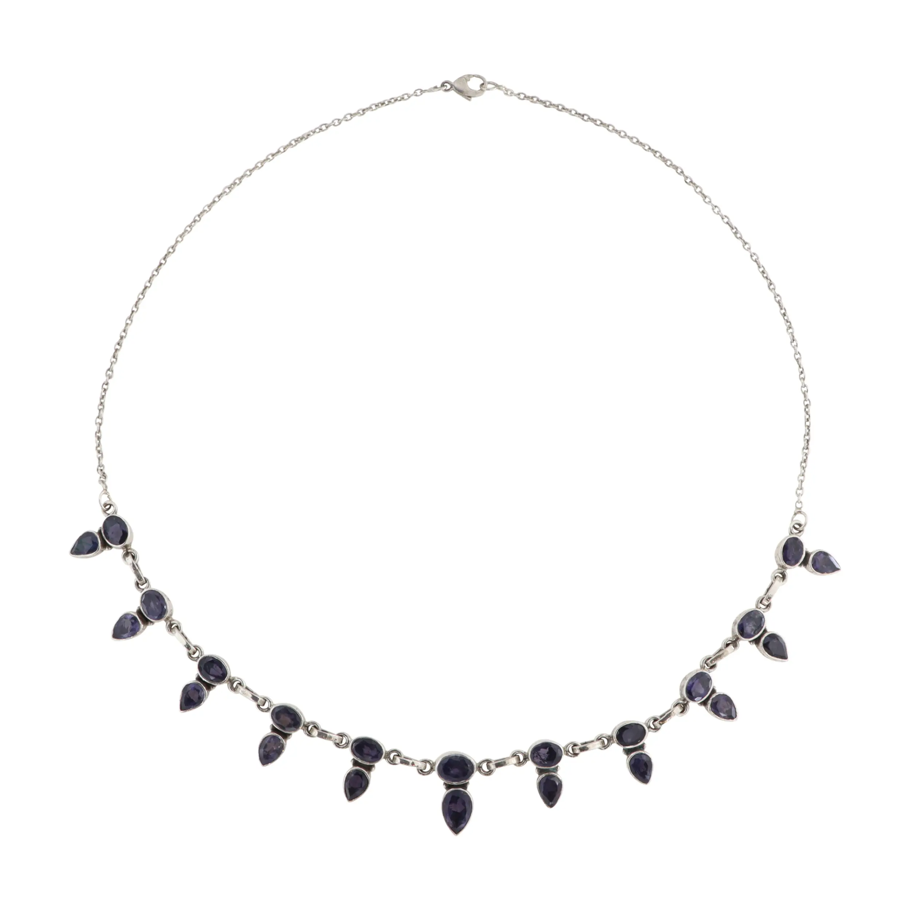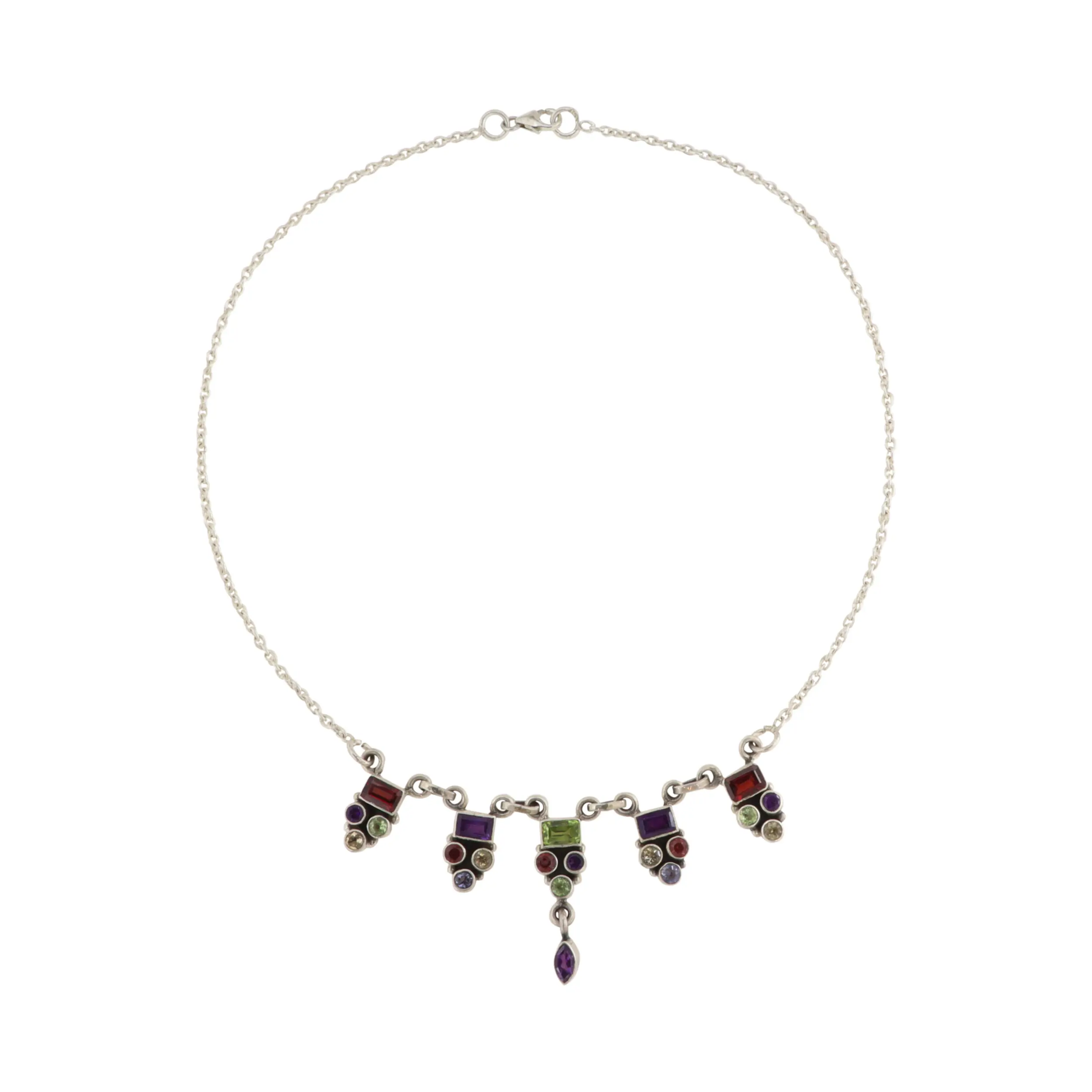 Upplev tidlös elegans med vårt ankarkedjahalsband, som kombinerar finaste sterlingsilver med en fantastisk kollektion av fasetterade ädelstenar. Varje halsband är ett mästerverk av hantverk som framhäver den råa skönheten hos bergskristall, iolit, granat, peridot, ametist och citrin. Dessa ädelstenar är noggrant utvalda och fasetterade för att maximera deras naturliga klarhet och briljans, vilket skapar ett förtrollande ljus- och färgspel som kommer att fånga ögat.