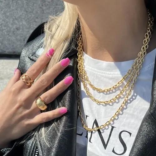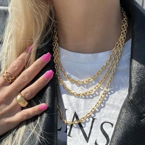 Halsbandet passar perfekt att styla med våra populära glasberlocker, men kan även bäras ensamt för en mer minimalistisk look. Den grova och platta ankarkedjan ger en modern känsla som kan kombineras med andra halsband för en lager-på-lager-look. Modellen visar alla tre längder, perfekt stylade med våra utvalda fingerringar, vilket ger en extra touch av stil.
