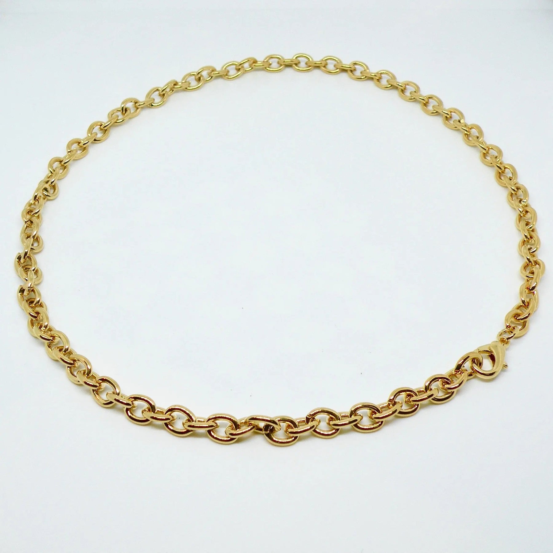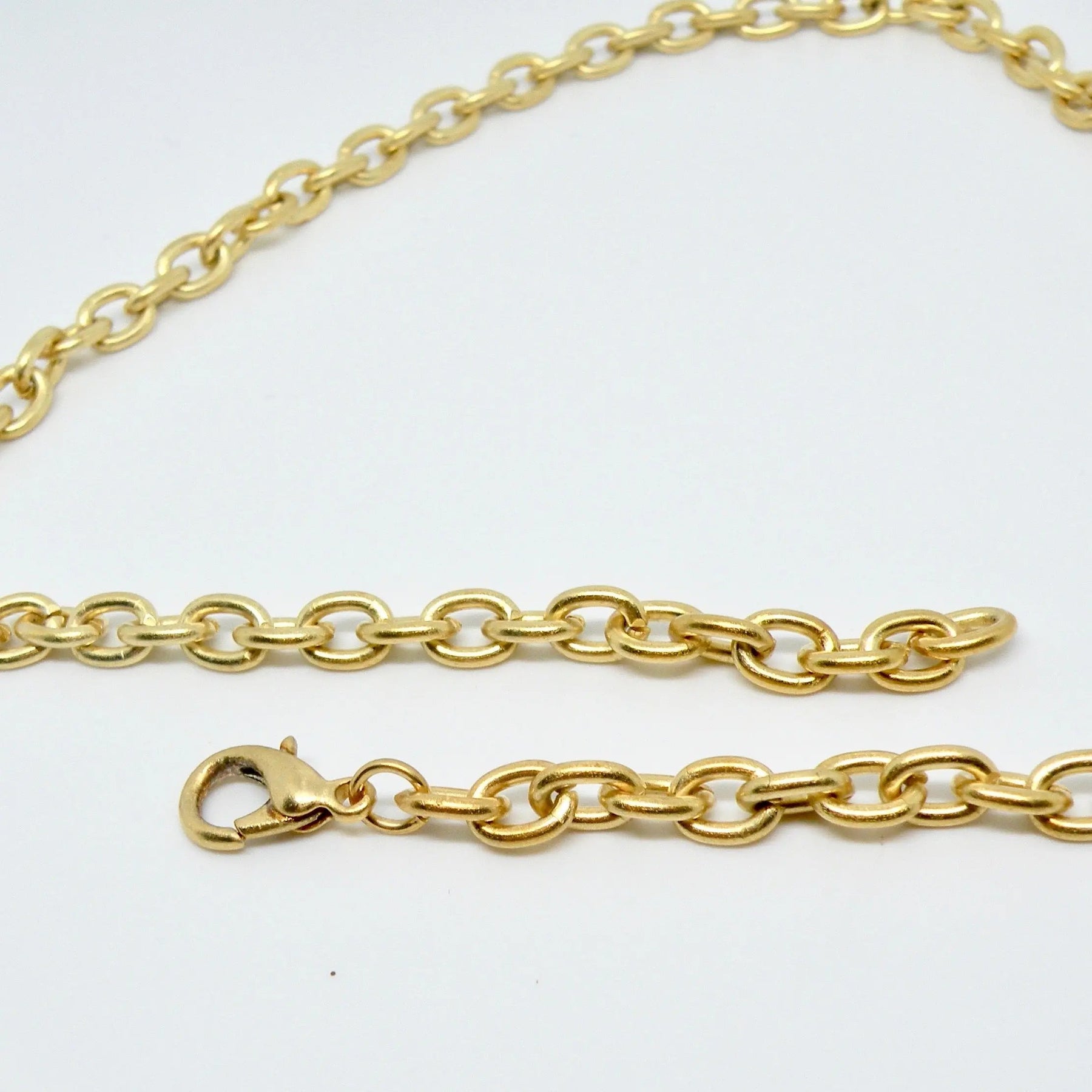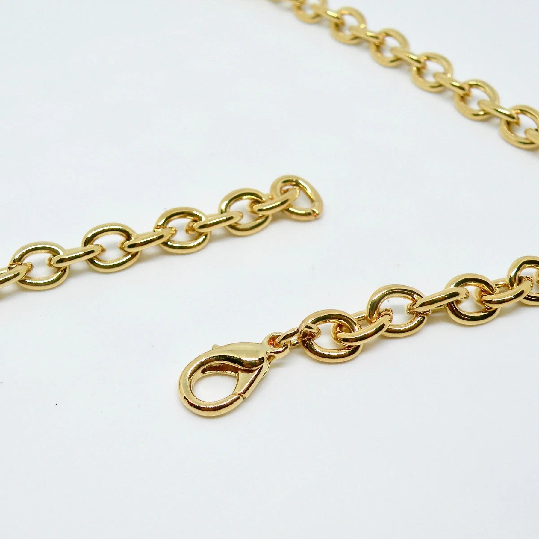 Det är viktigt att ta av sig smycken när man simmar i klorerat eller saltvatten, eftersom mässing kan reagera kemiskt och missfärgas med tiden. Observera att kedjorna endast är pläterade, vilket innebär att färgen kan blekna, men detta gör dem också till ett otroligt prisvärt alternativ för att uppgradera din smyckessamling.