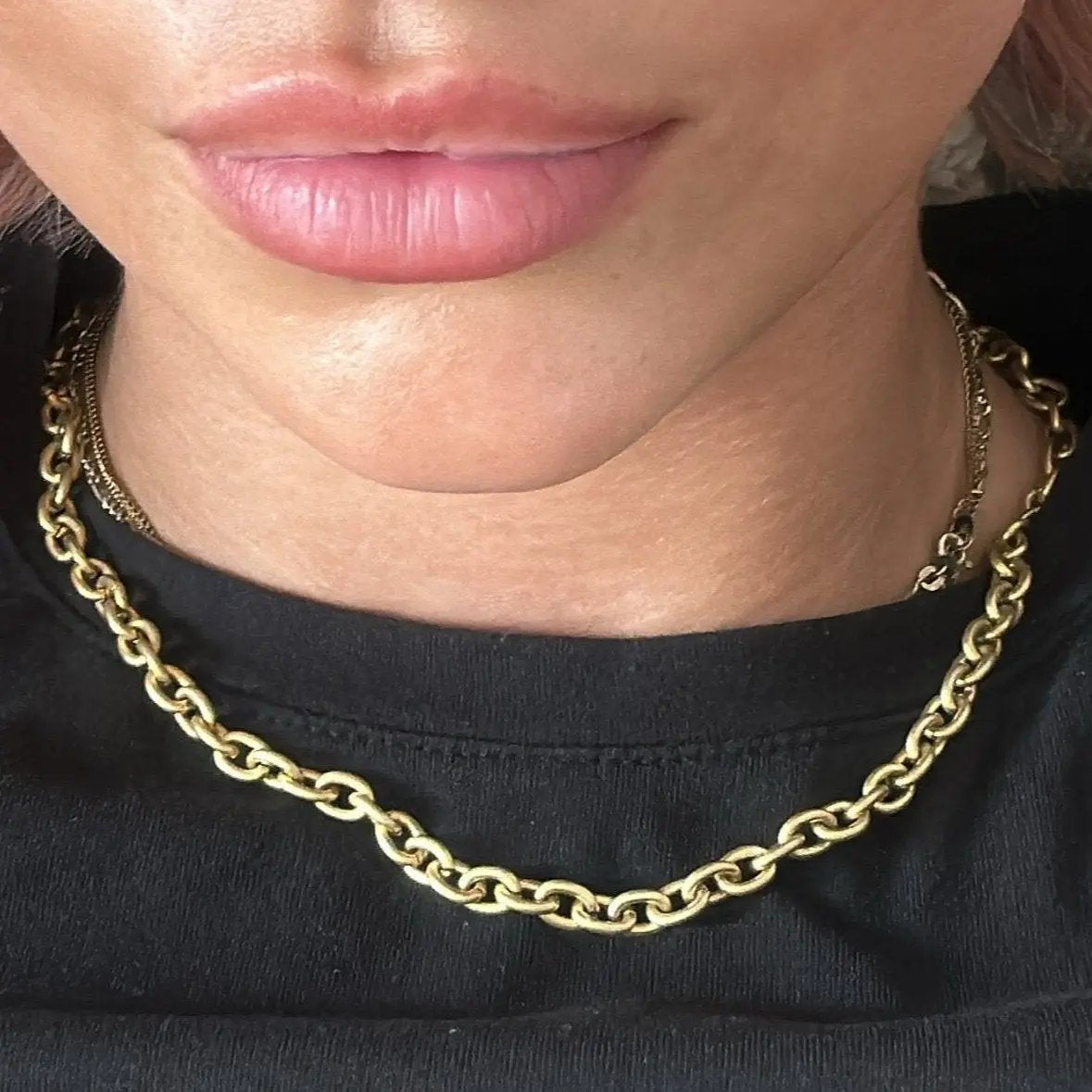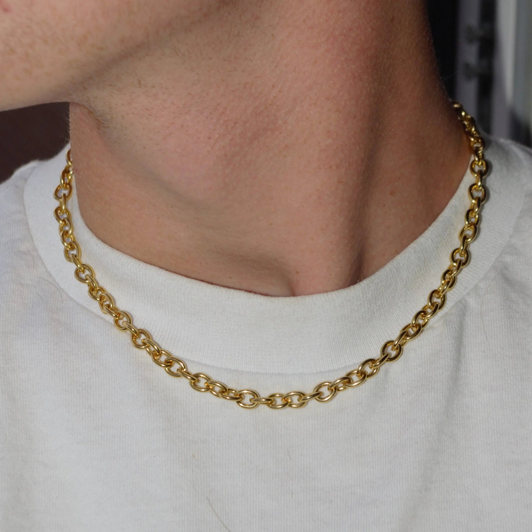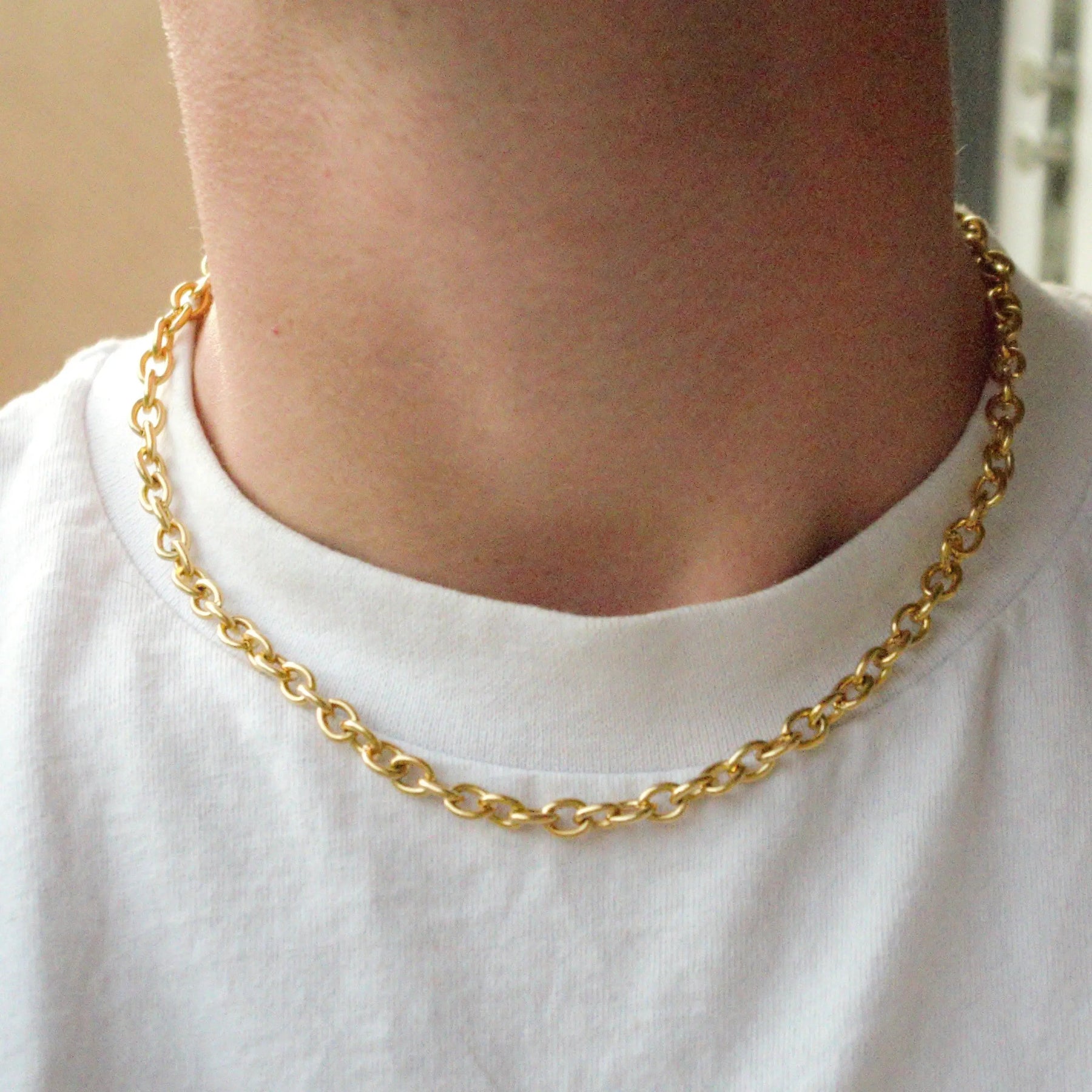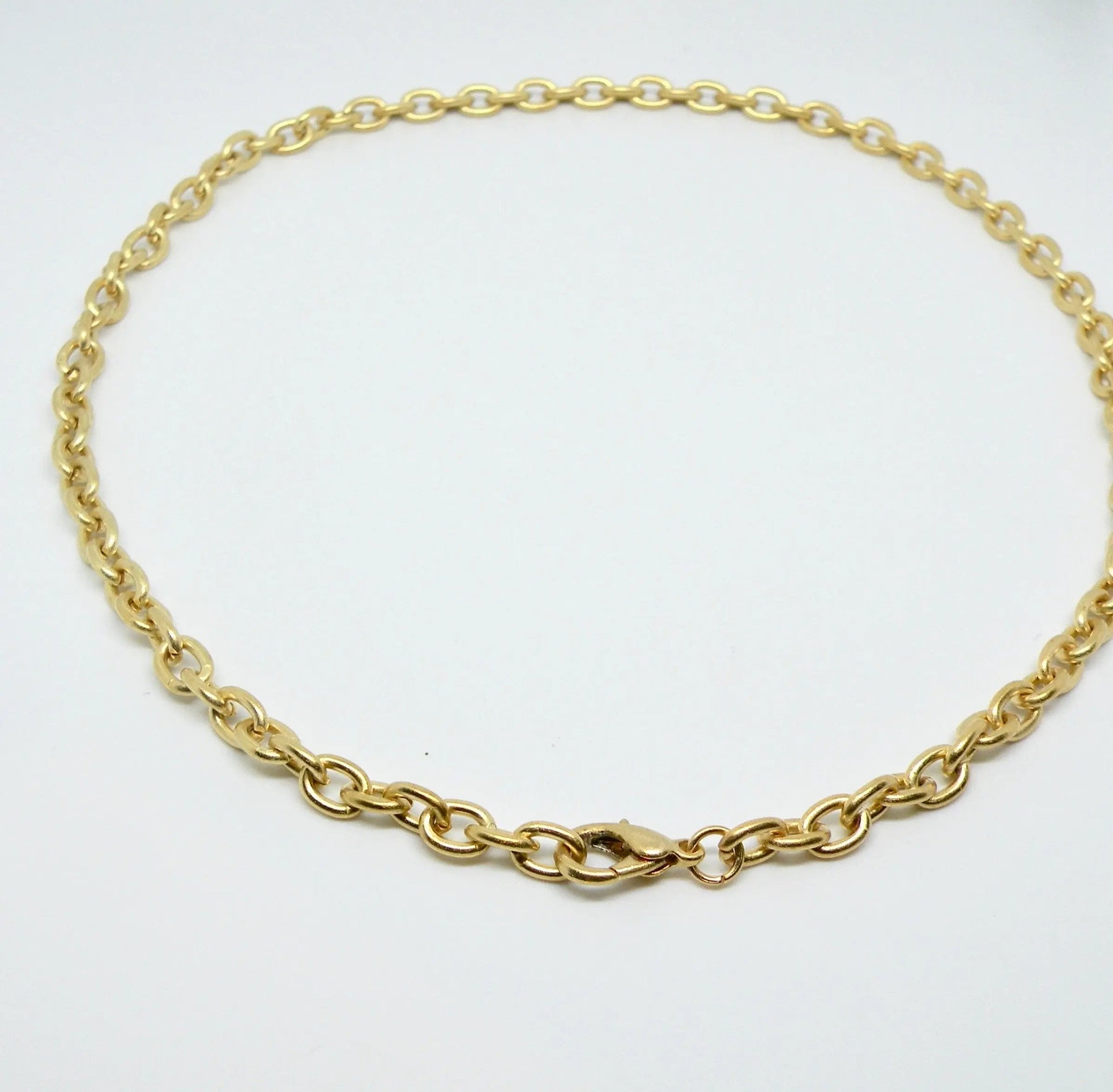 Det är viktigt att ta av sig smycken när man simmar i klorerat eller saltvatten, eftersom mässing kan reagera kemiskt och missfärgas med tiden. Observera att kedjorna endast är pläterade, vilket innebär att färgen kan blekna, men detta gör dem också till ett otroligt prisvärt alternativ för att uppgradera din smyckessamling.