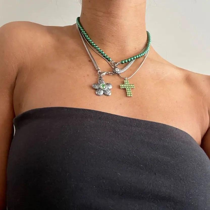 Halsband med hänge, blomma med kristall, oxiderad försilvrad mässing