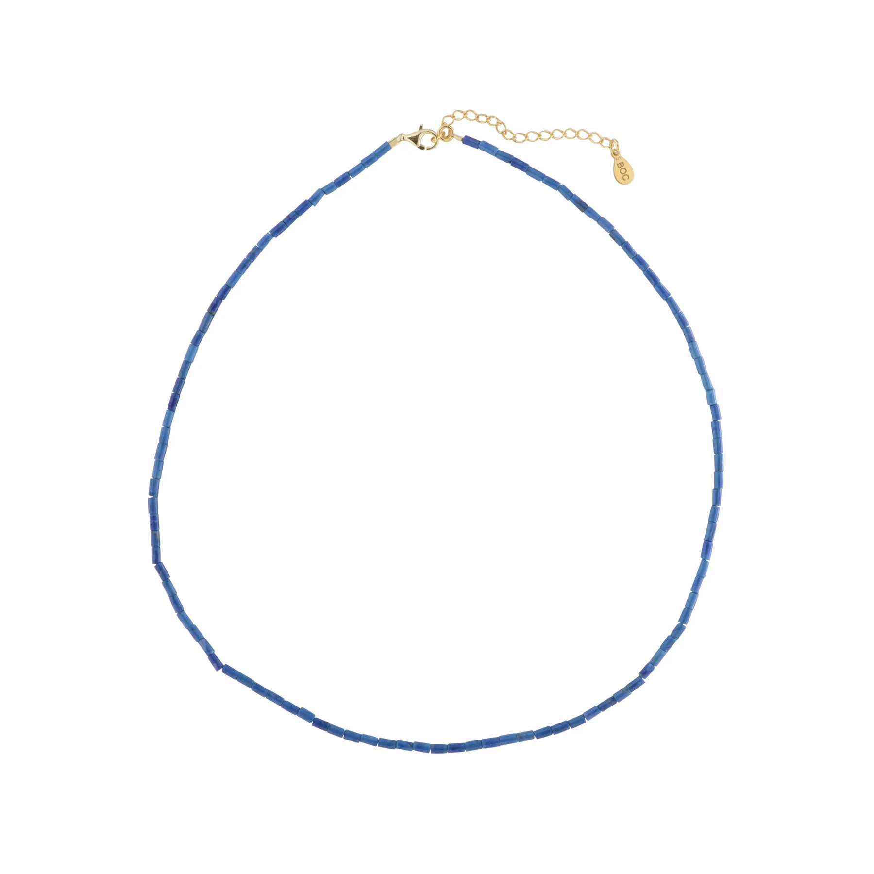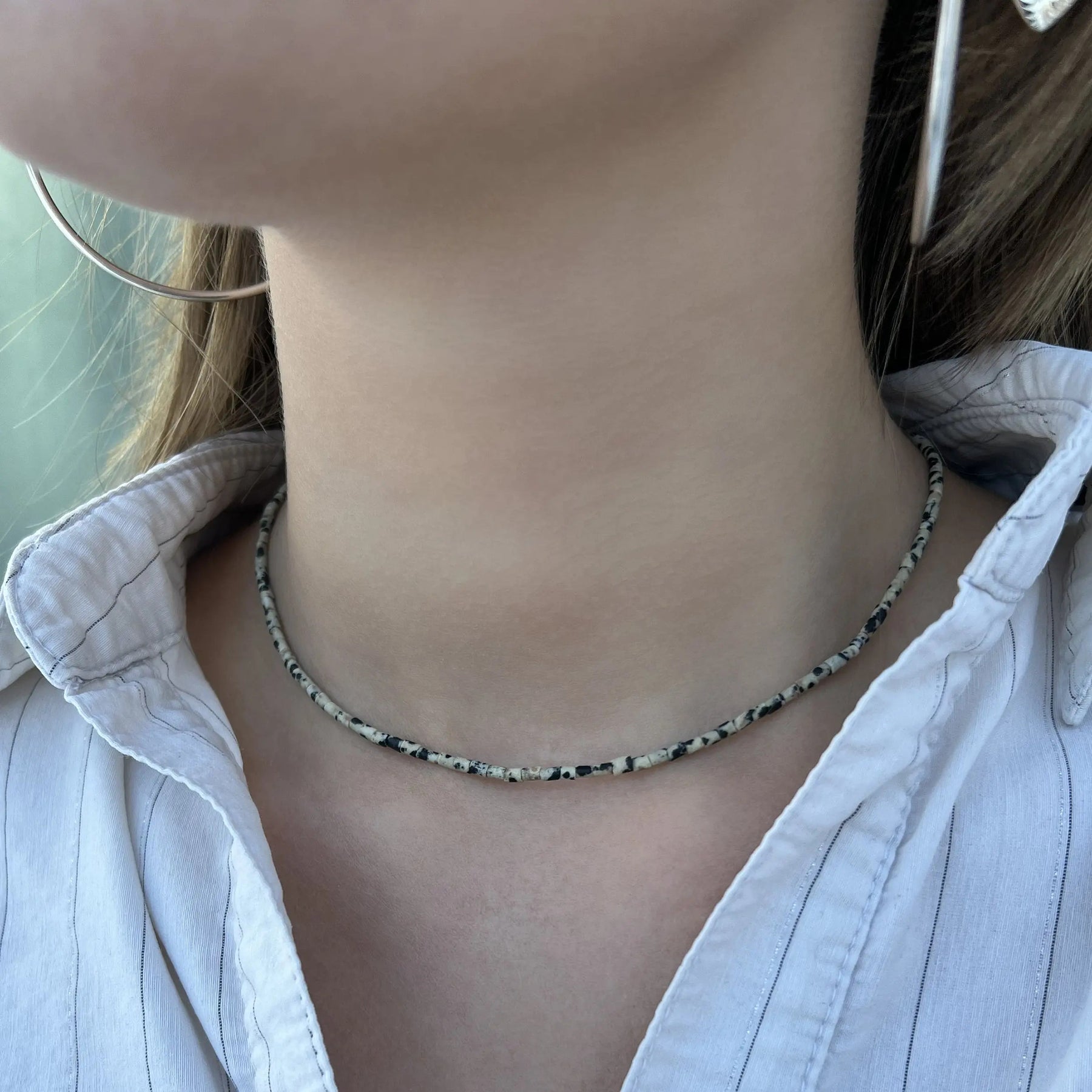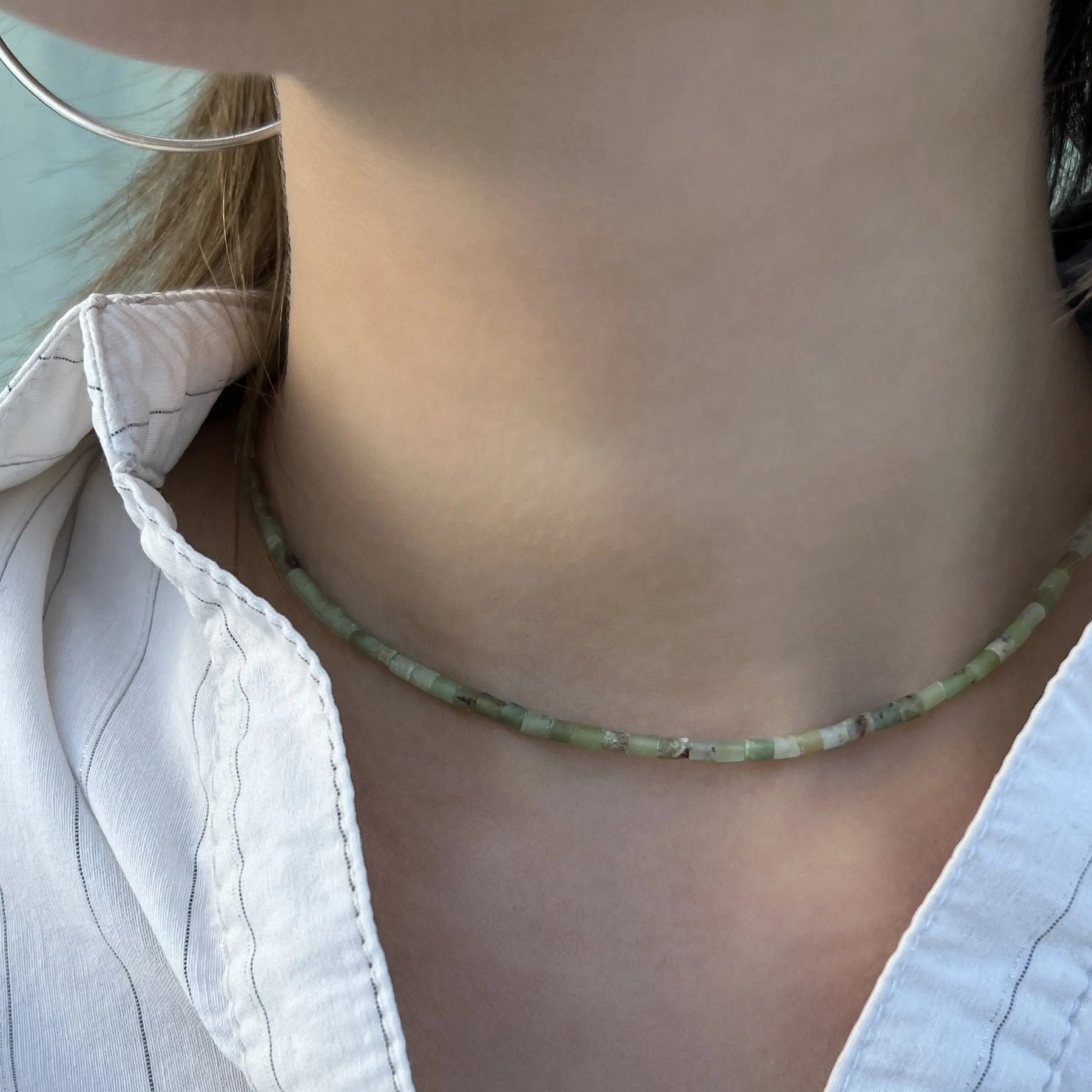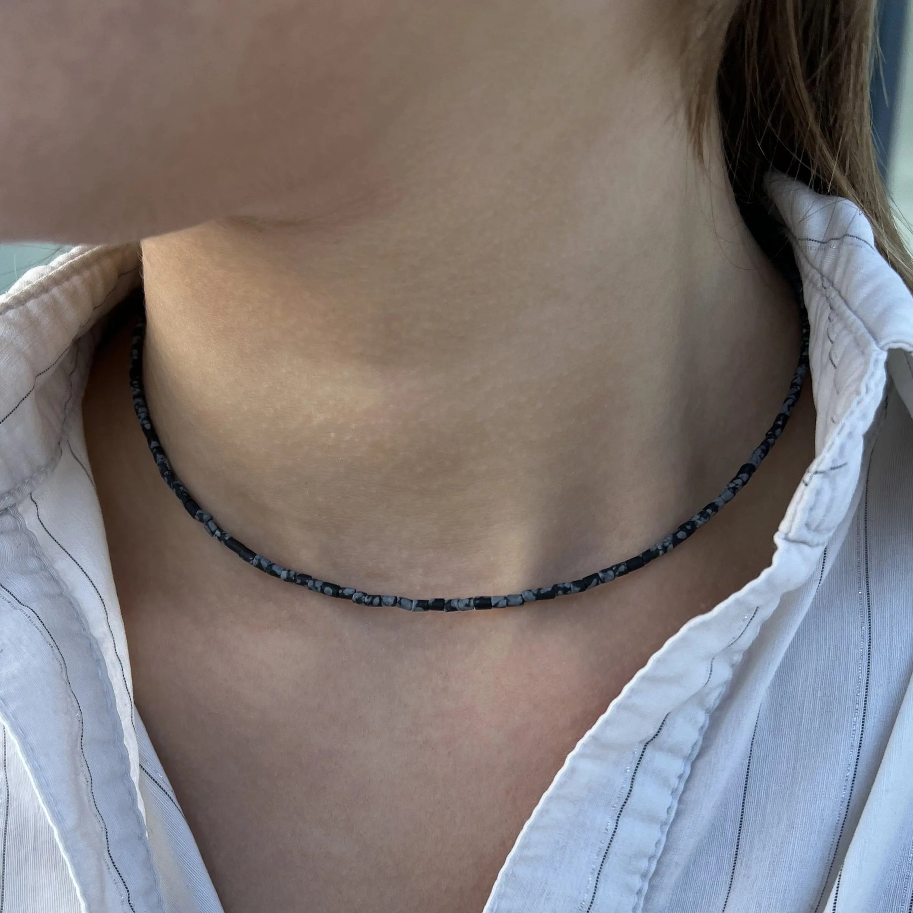 Unna dig ett elegant halsband med en vacker kombination av rörpärlor i olika ädelstenar, inklusive sodalit, rhodonit, krysopras, dalmatisk jaspis, snöflingeobsidian och turkos. Varje halsband är omsorgsfullt monterat med ett spänne och kedjeförlängare i antingen sterlingsilver eller förgyllt sterlingsilver, vilket ger en lyxig finish och säkerställer hållbarhet.