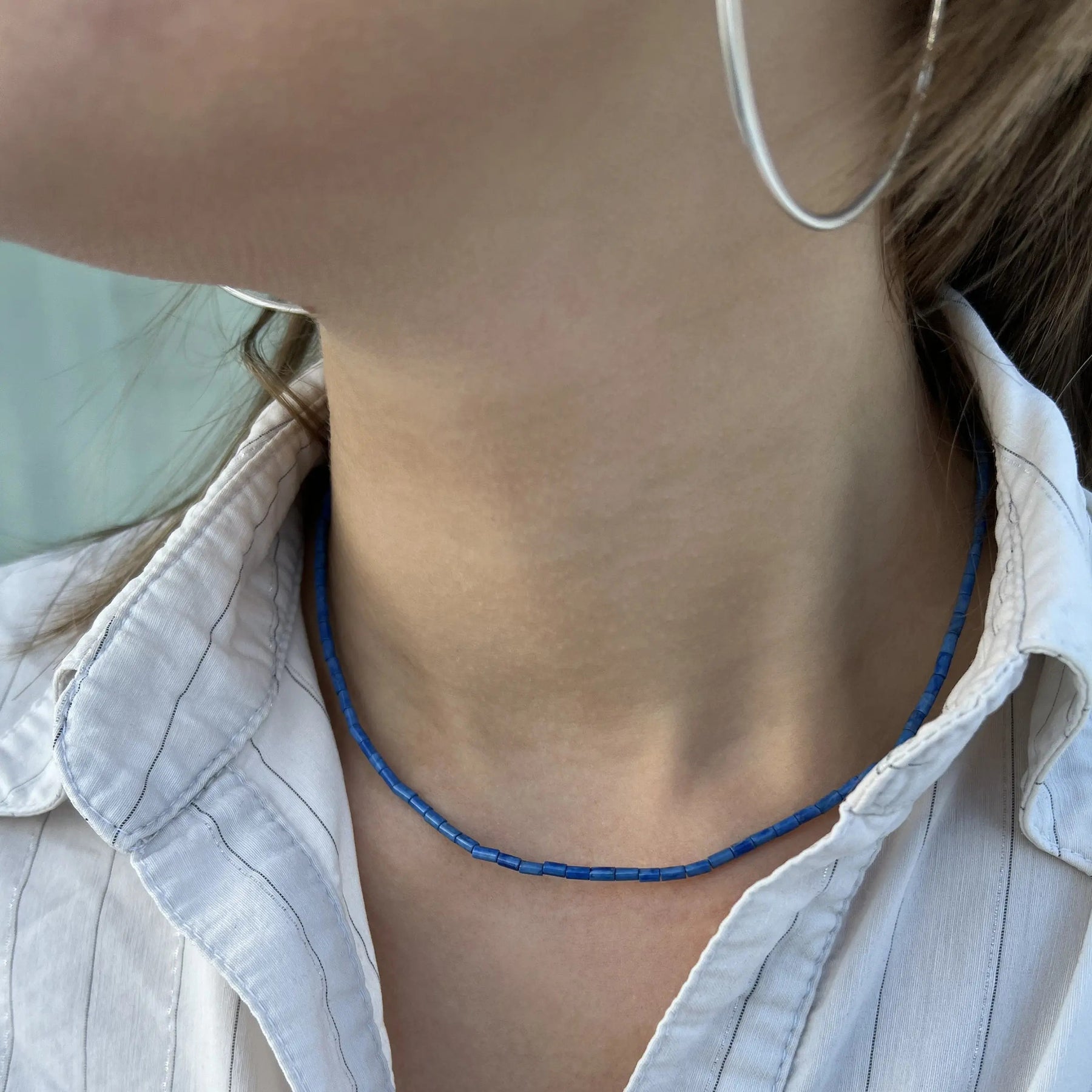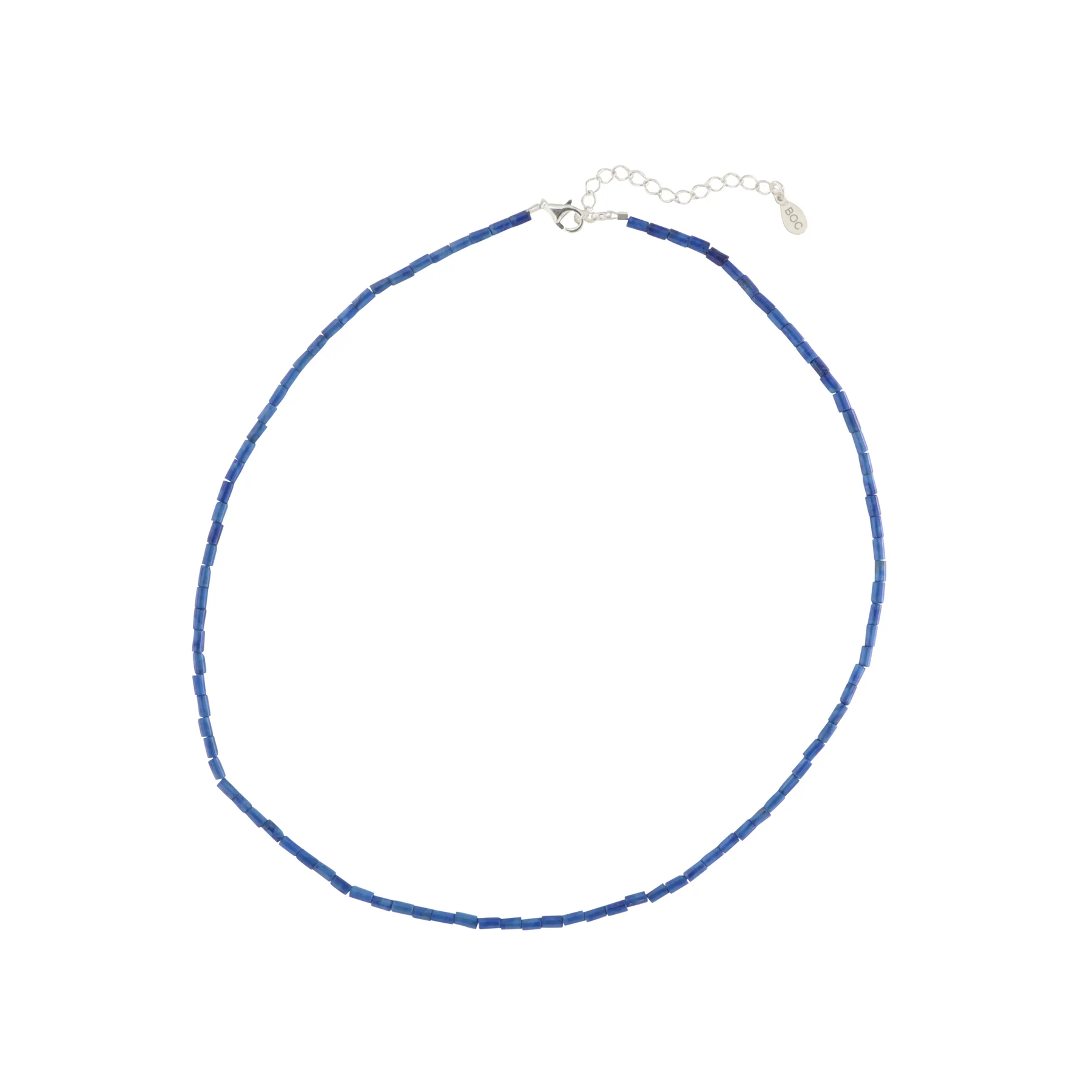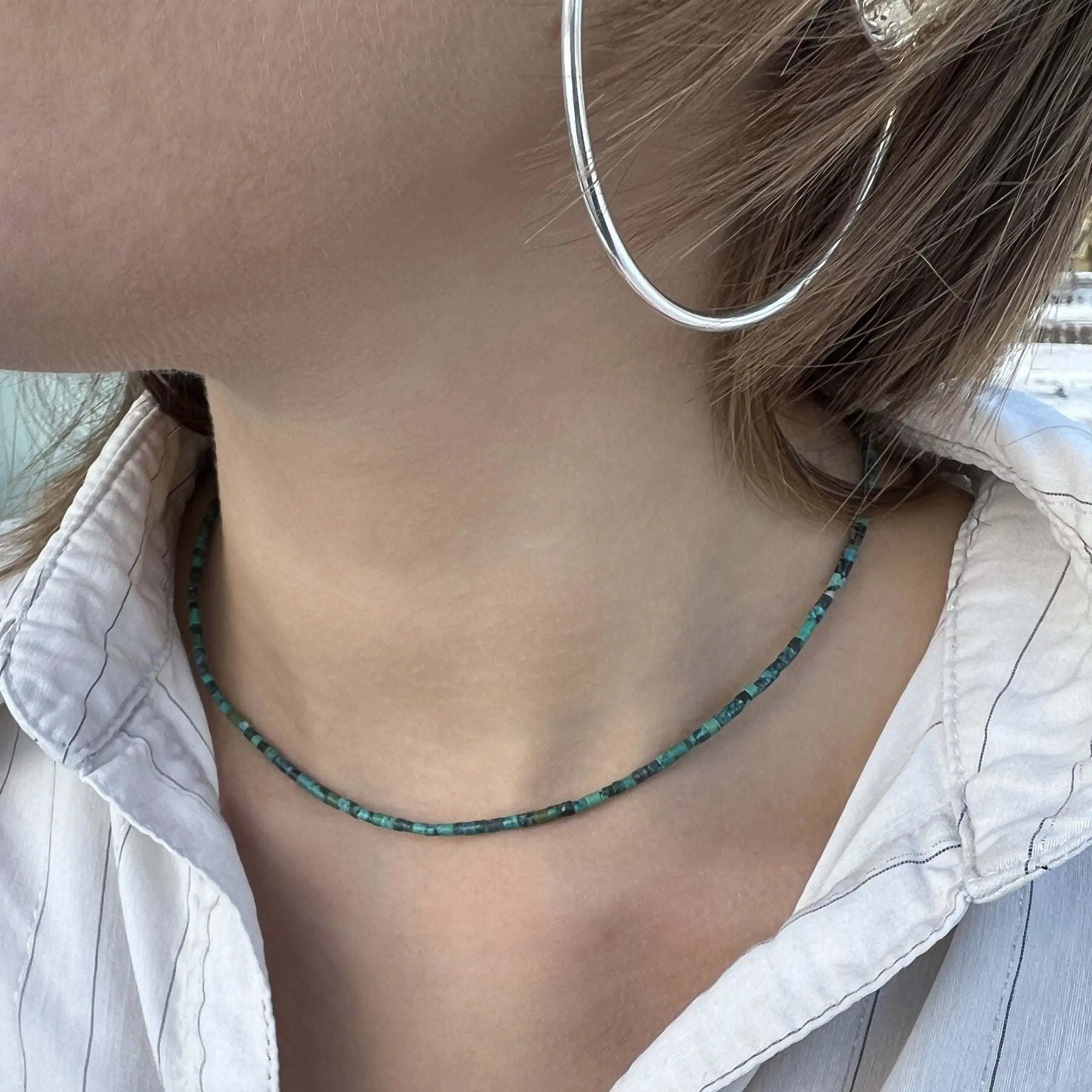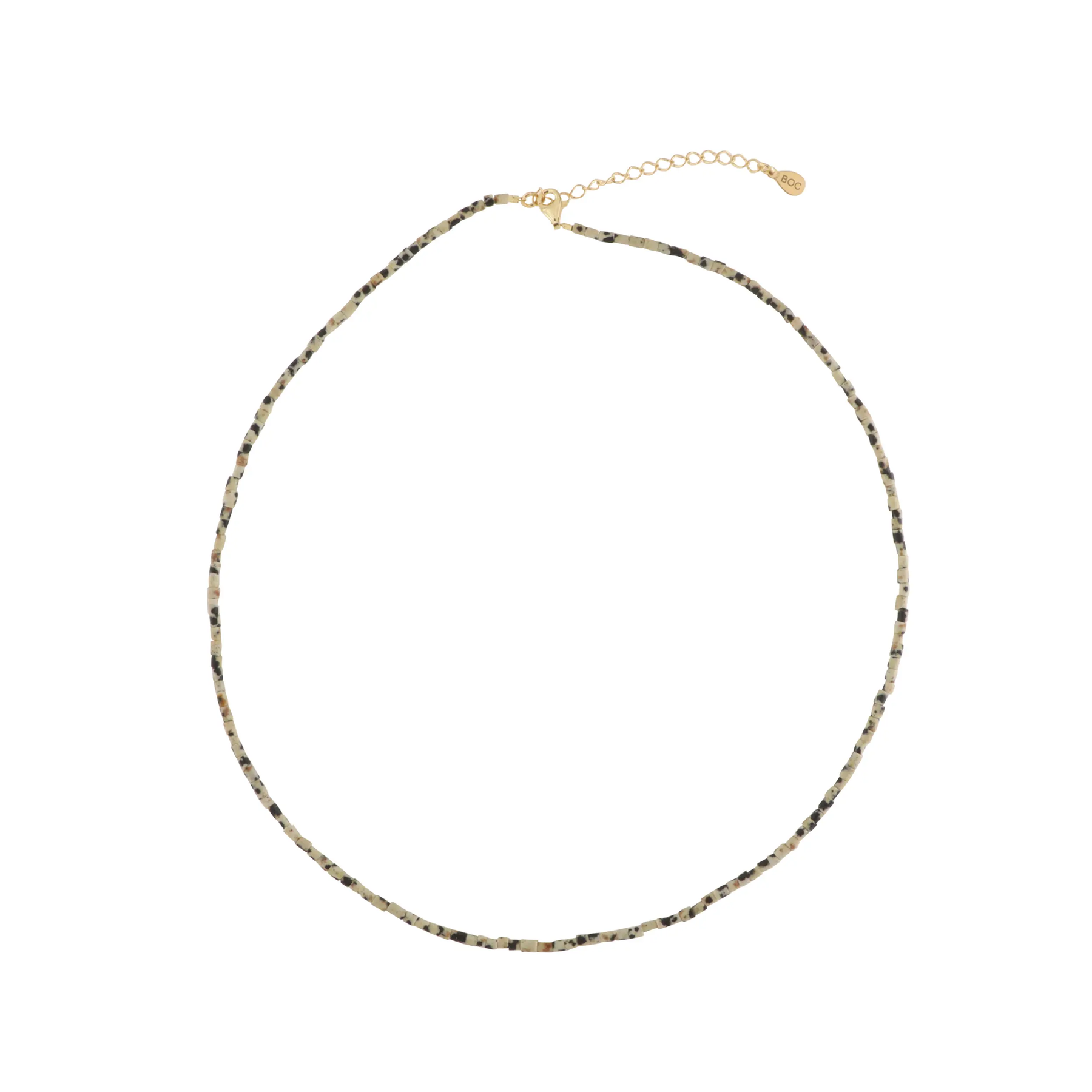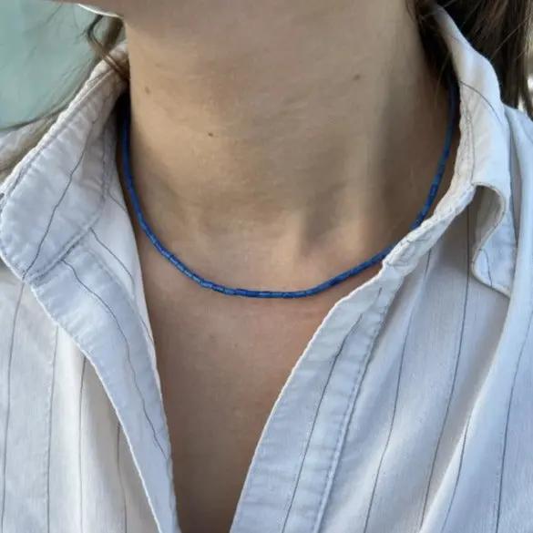 Unna dig ett elegant halsband med en vacker kombination av rörpärlor i olika ädelstenar, inklusive sodalit, rhodonit, krysopras, dalmatisk jaspis, snöflingeobsidian och turkos. Varje halsband är omsorgsfullt monterat med ett spänne och kedjeförlängare i antingen sterlingsilver eller förgyllt sterlingsilver, vilket ger en lyxig finish och säkerställer hållbarhet.