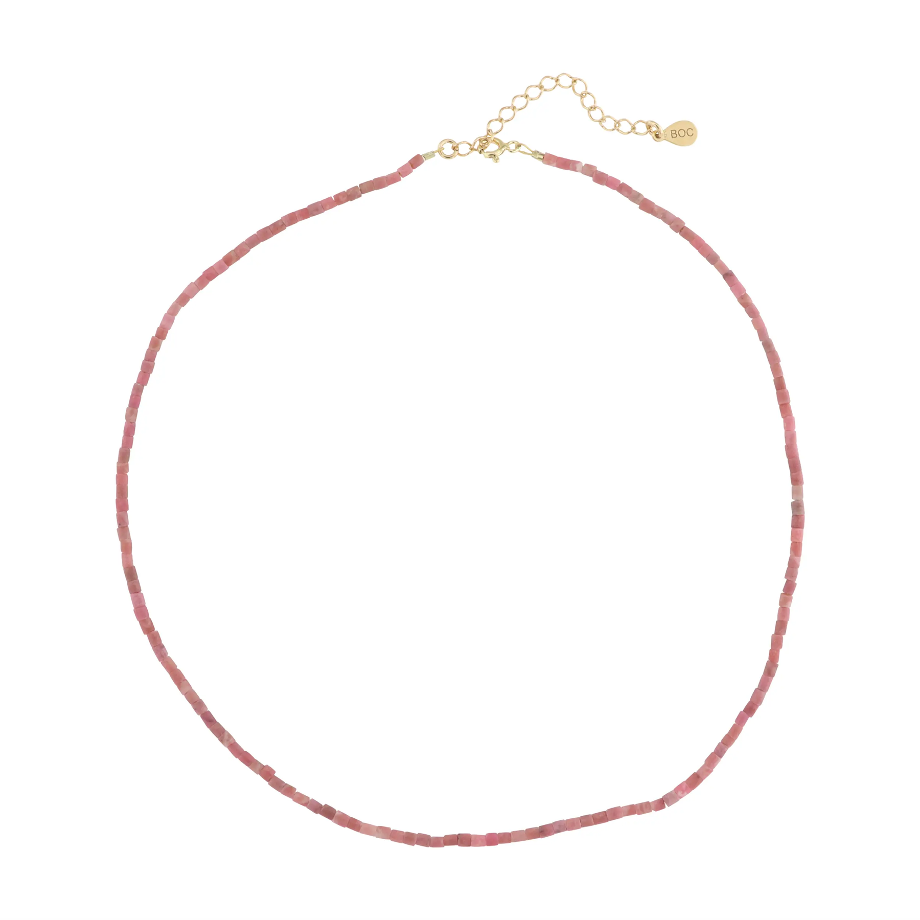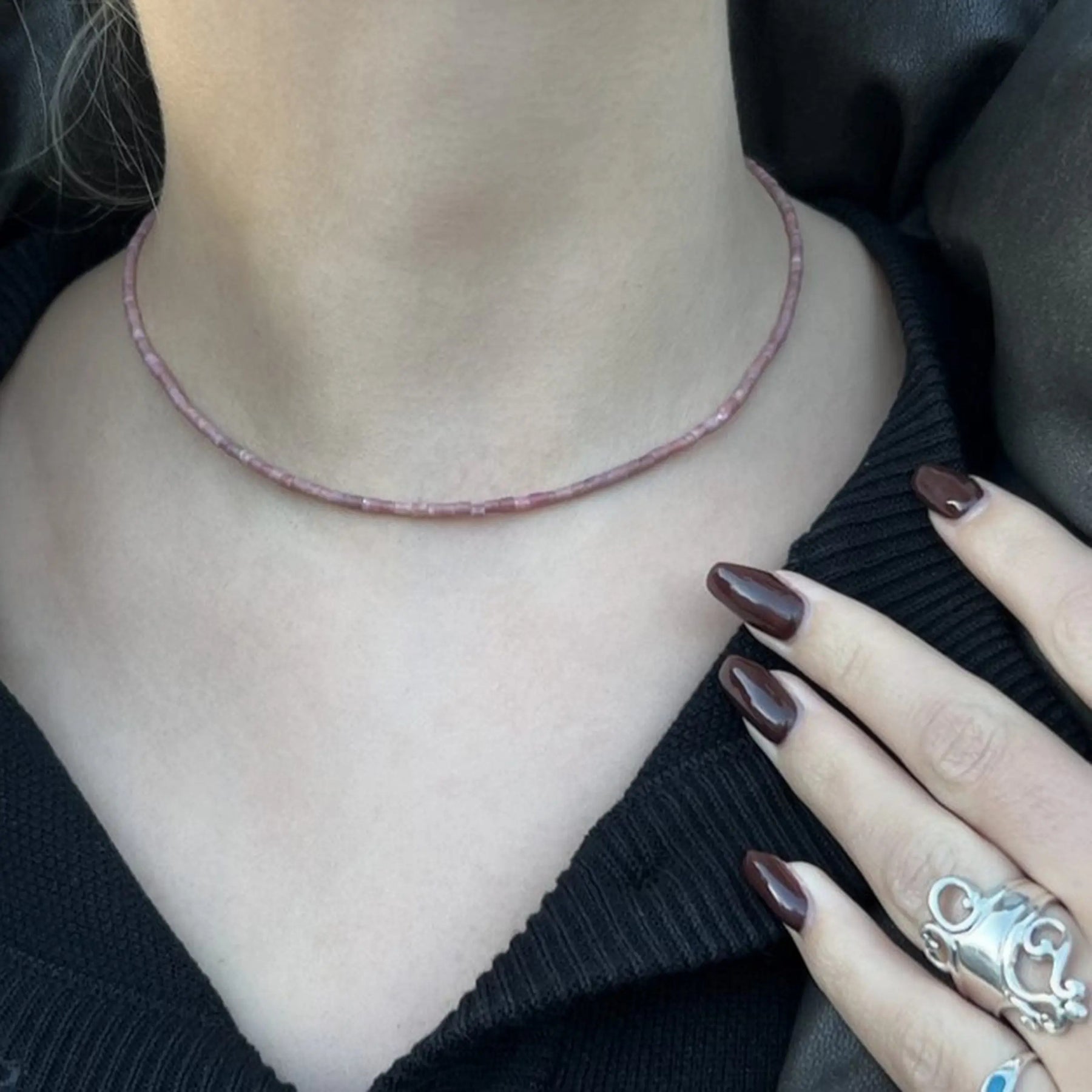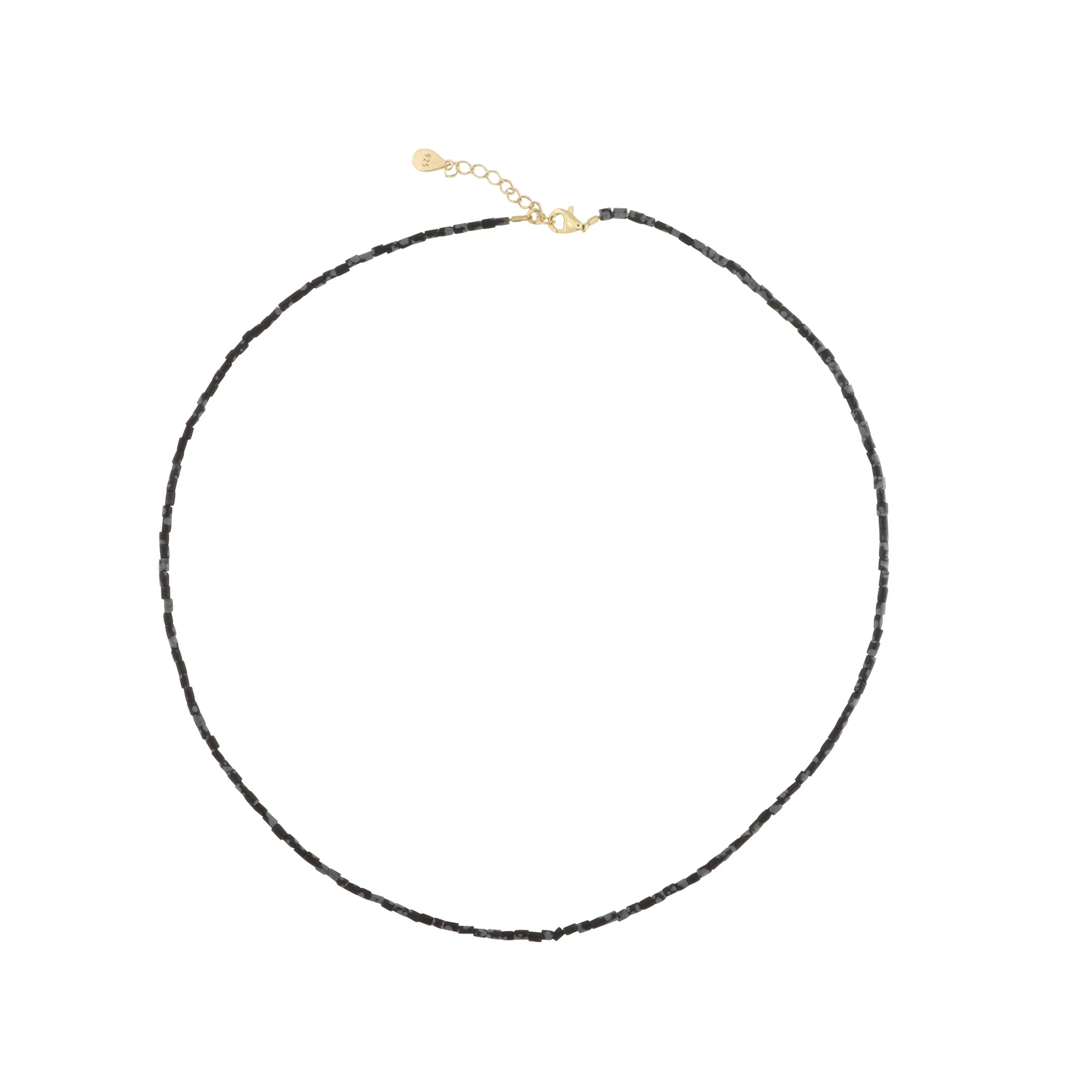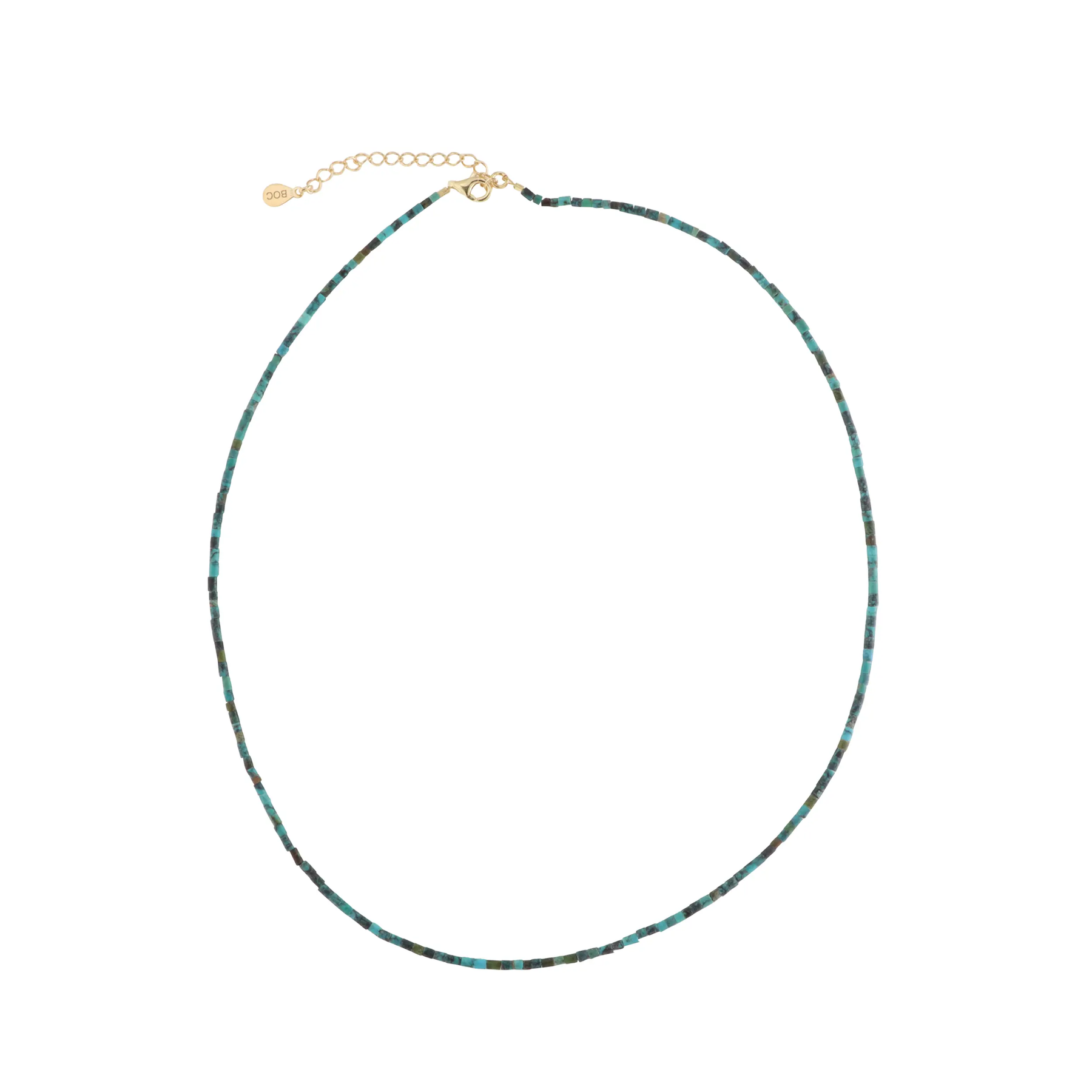 Unna dig ett elegant halsband med en vacker kombination av rörpärlor i olika ädelstenar, inklusive sodalit, rhodonit, krysopras, dalmatisk jaspis, snöflingeobsidian och turkos. Varje halsband är omsorgsfullt monterat med ett spänne och kedjeförlängare i antingen sterlingsilver eller förgyllt sterlingsilver, vilket ger en lyxig finish och säkerställer hållbarhet.