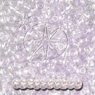 Små tydliga transparenta glaspärlor med pastelllila pärlfoder.