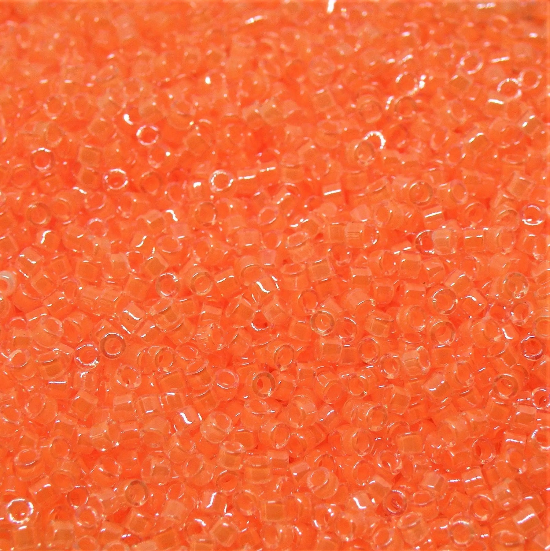 Liten tydlig transparent Miyuki Delica Rörformade glaspärlor med orange foder och glansig yta.