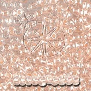 Små tydliga transparenta glaspärlor med laxfärgat foder och pärlemor.