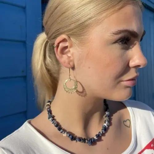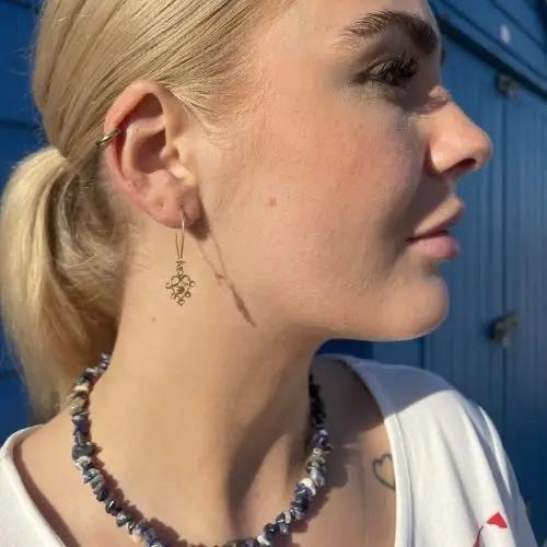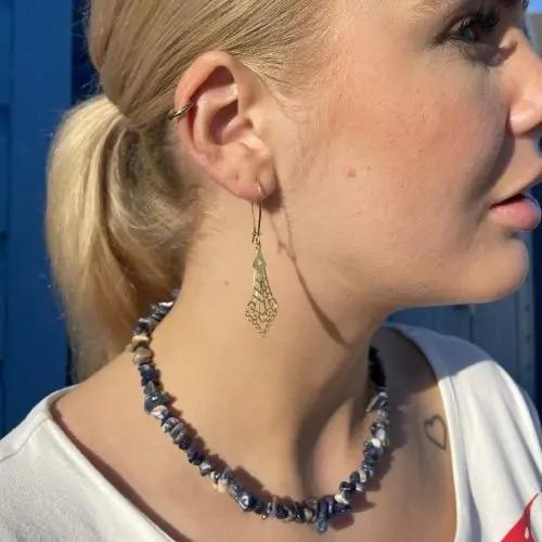 Dessa örhängen kan köpas individuellt eller som ett par, så att du kan välja det som bäst passar din smyckessamling. På bilderna är örhängena stylade med en förgylld silverörhänge och ett halsband med sodalitsten, vilket framhäver deras mångsidighet och skönhet.
