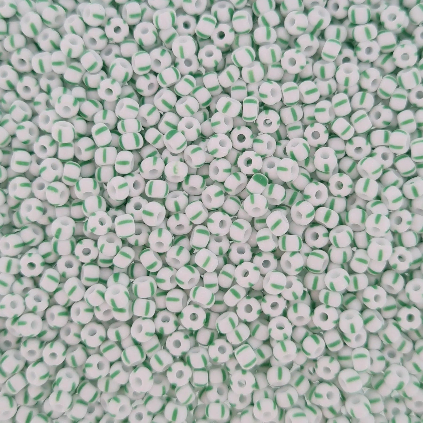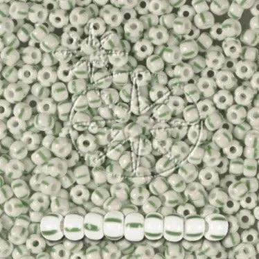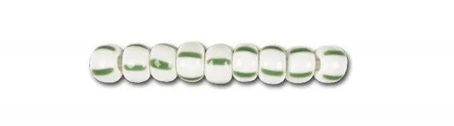 Randiga glaspärlor, preciosa, vita/4 gröna ränder