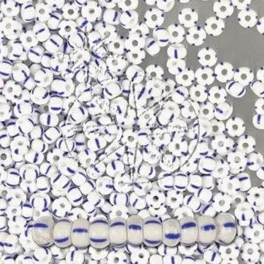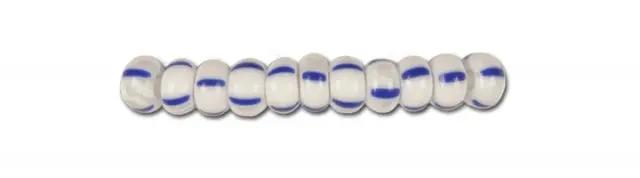 Randiga glaspärlor, preciosa, vita/4 blå ränder