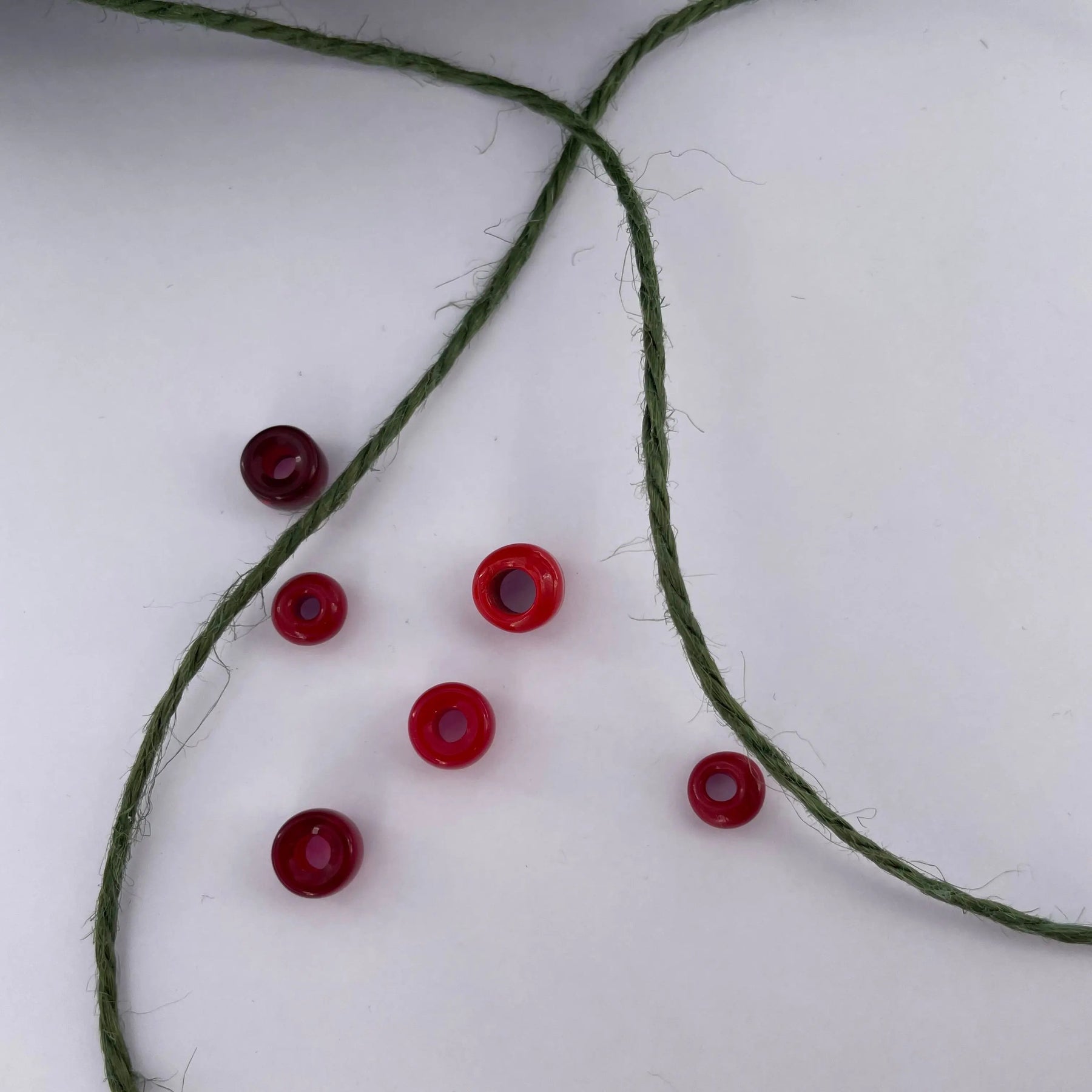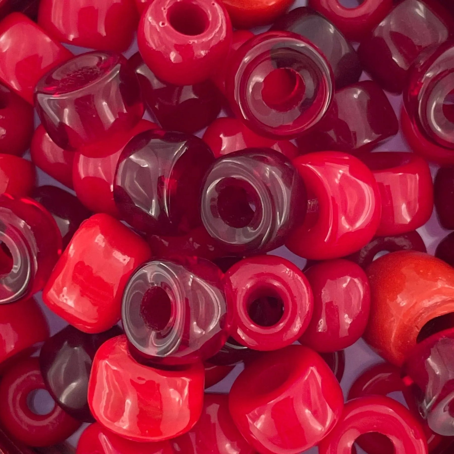 Stora glaspärlor i vackra röda färger som är perfekta för ditt nästa stickprojekt.
