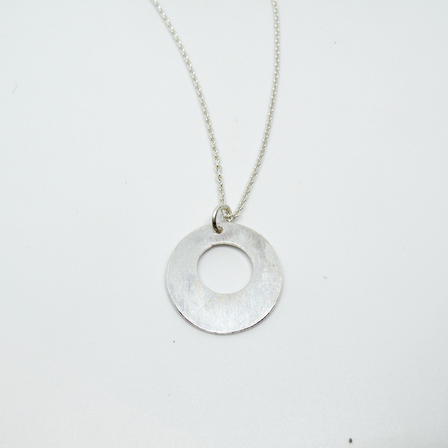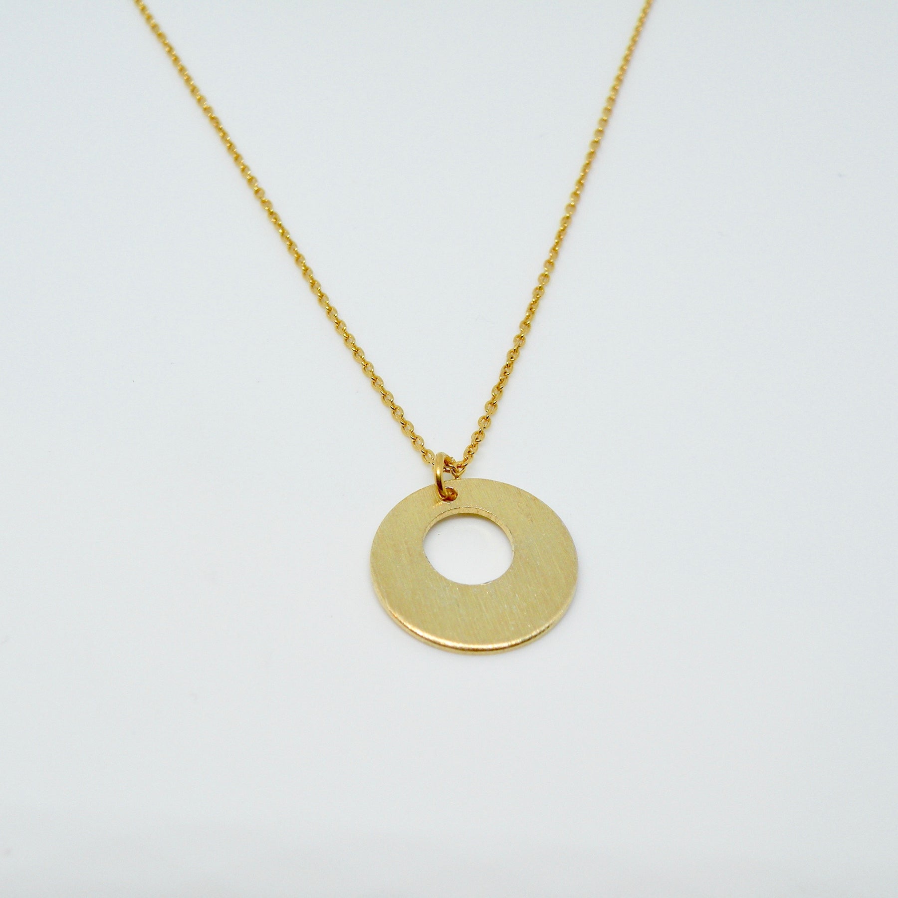 Upptäck det eleganta hänget som kombinerar tidlös skönhet med modern design. Detta hänge är format som en cirkel med ett unikt hål, finns i både förgyllt sterlingsilver och borstat sterlingsilver. Med en diameter på 15 mm är det det perfekta tillskottet till vilken smyckessamling som helst.